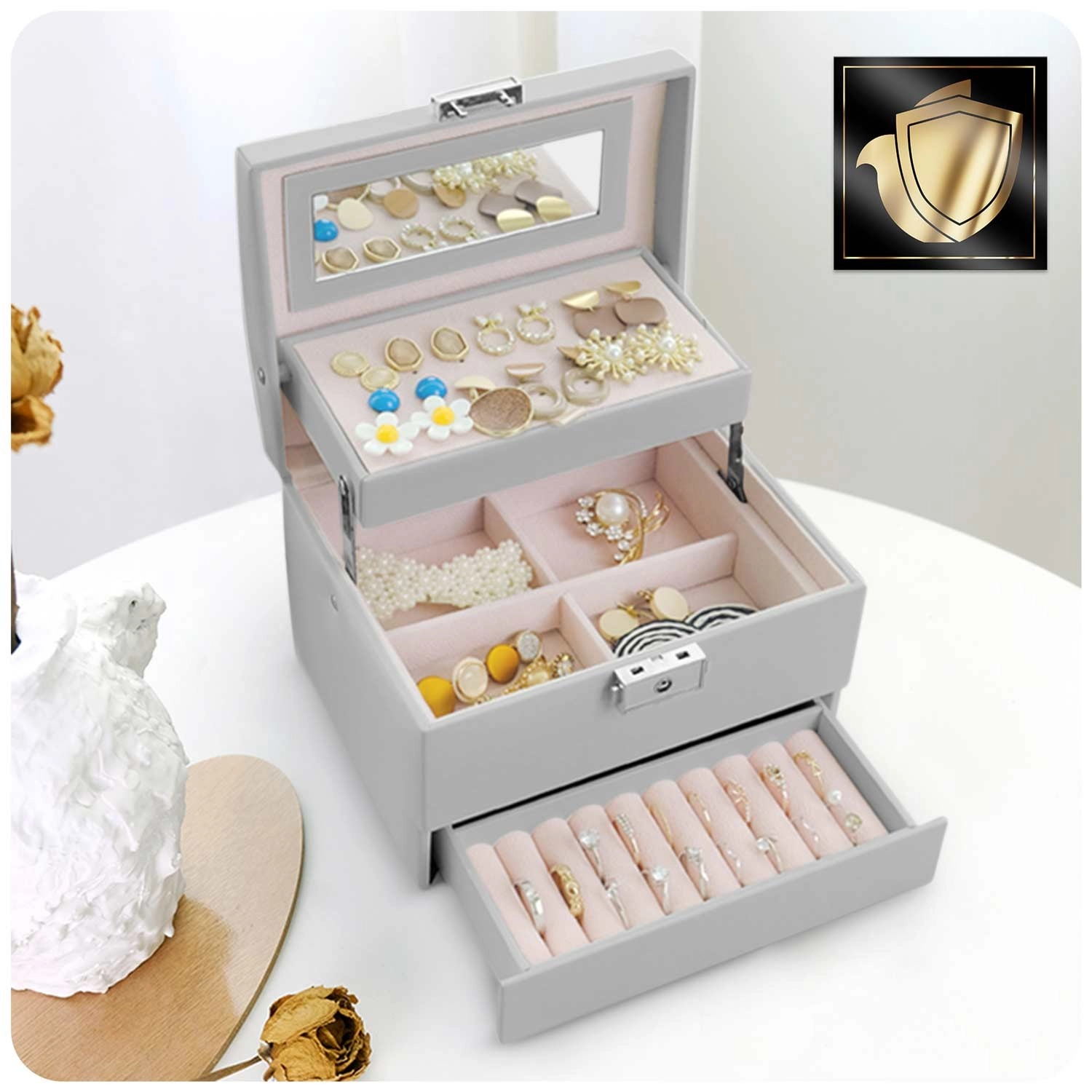 Spejl under låget, perforeret plade til øreringe, separate sektioner og ruller til ringe holder alting pænt organiseret og lige ved hånden.