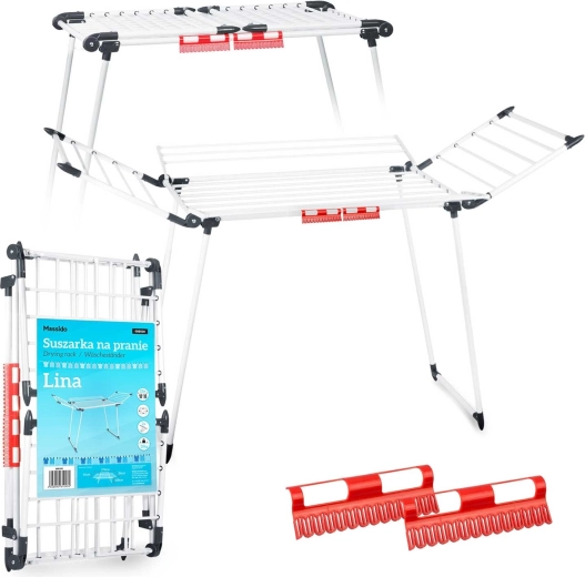 Praktisk og rummeligt tørrestativ til tøj MASSIDO Lina tilbyder op til 22 m tørreplads, 4 udklappelige vinger og holdere til småt tøj. Takket være den robuste metalkonstruktion er det stabilt, nemt at folde sammen og folde ud, og de kraftigere stænger hjælper med at reducere unødvendige folder. Ideelt til hurtig og skånsom tørring derhjemme eller på altanen.