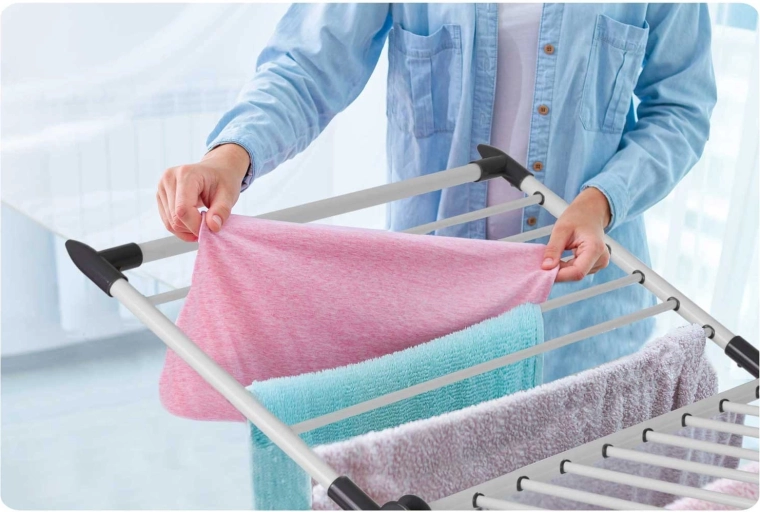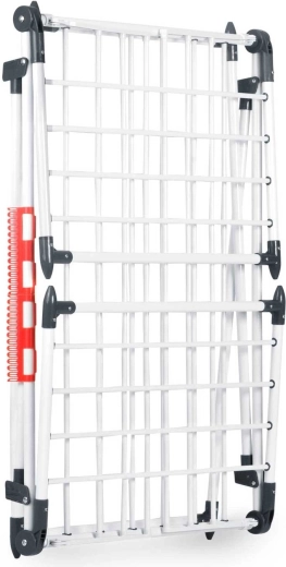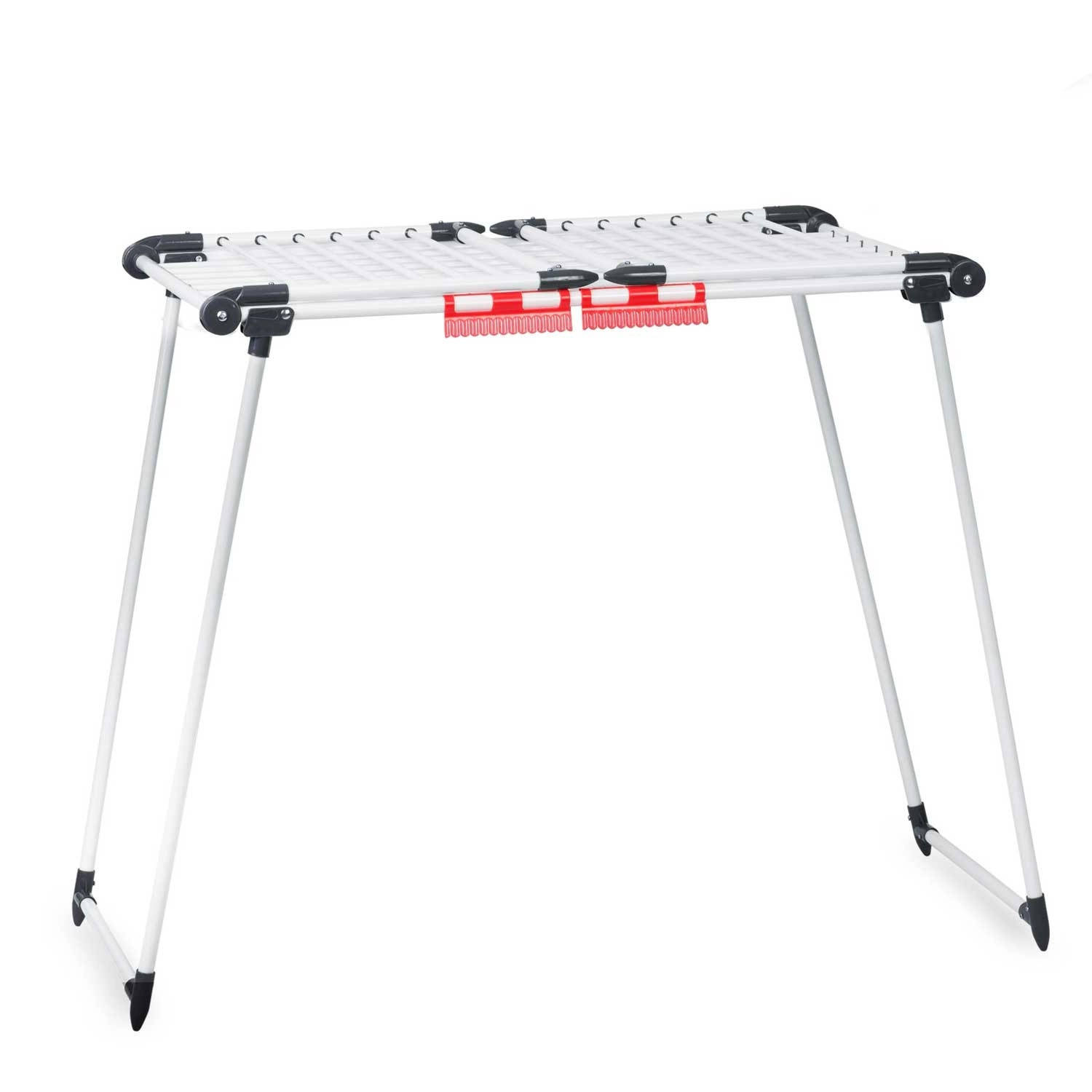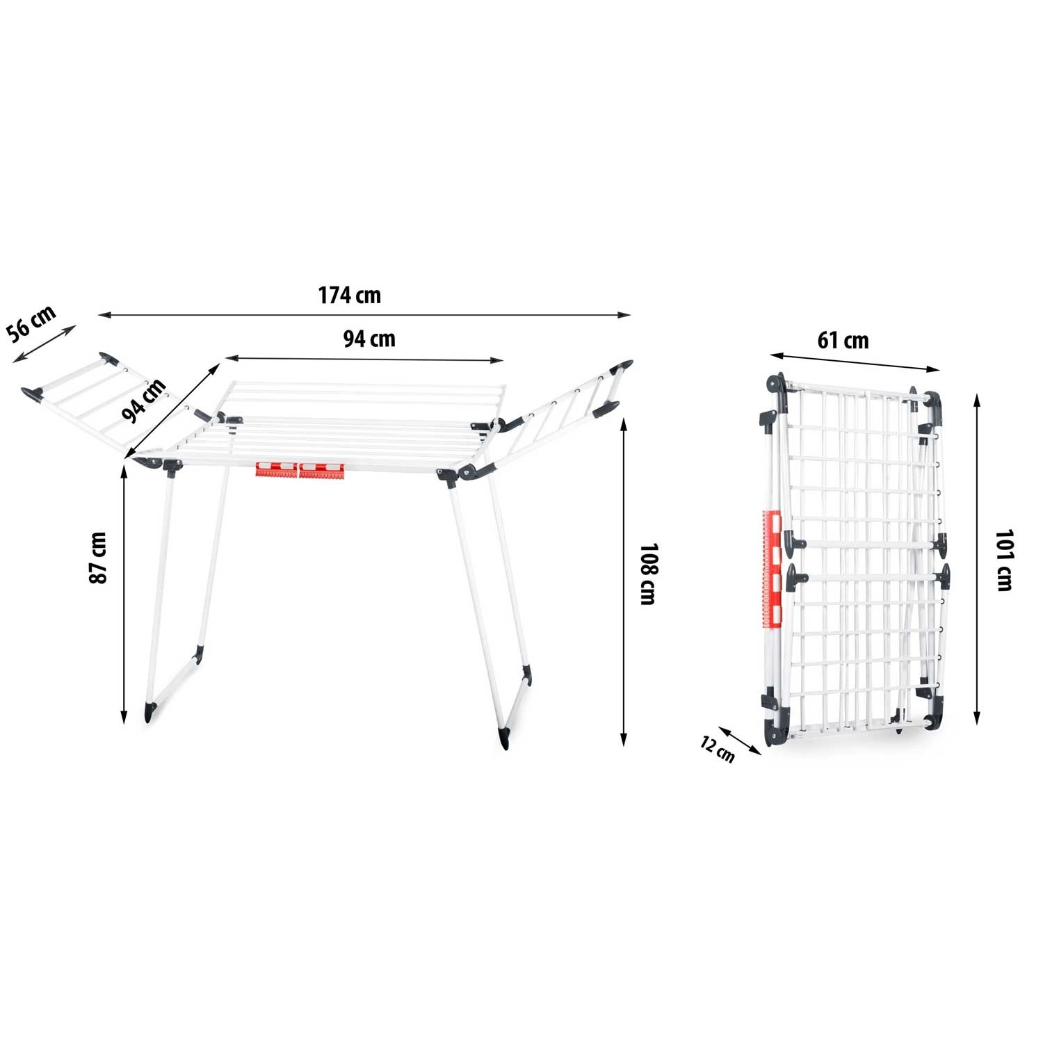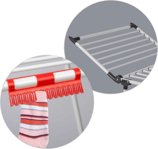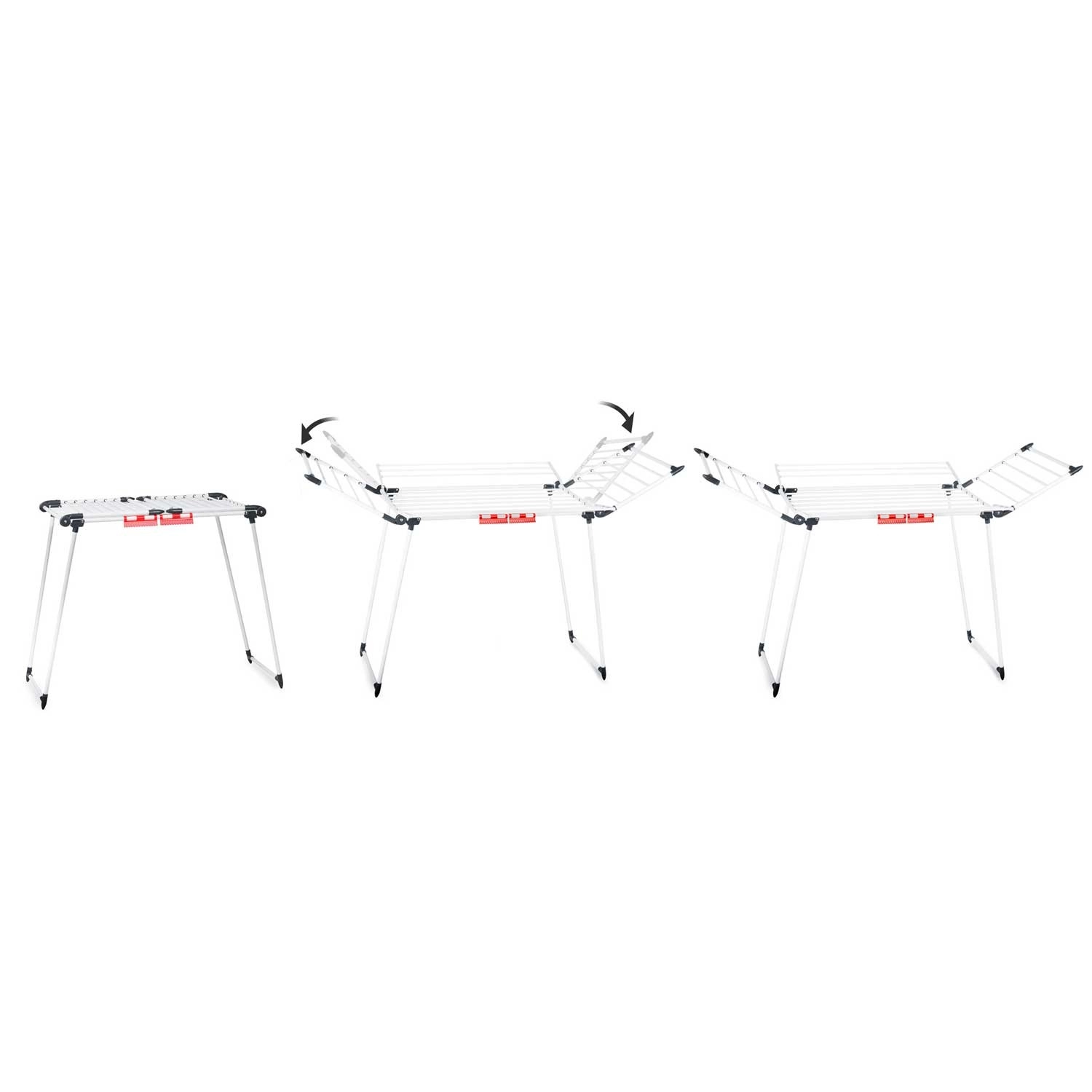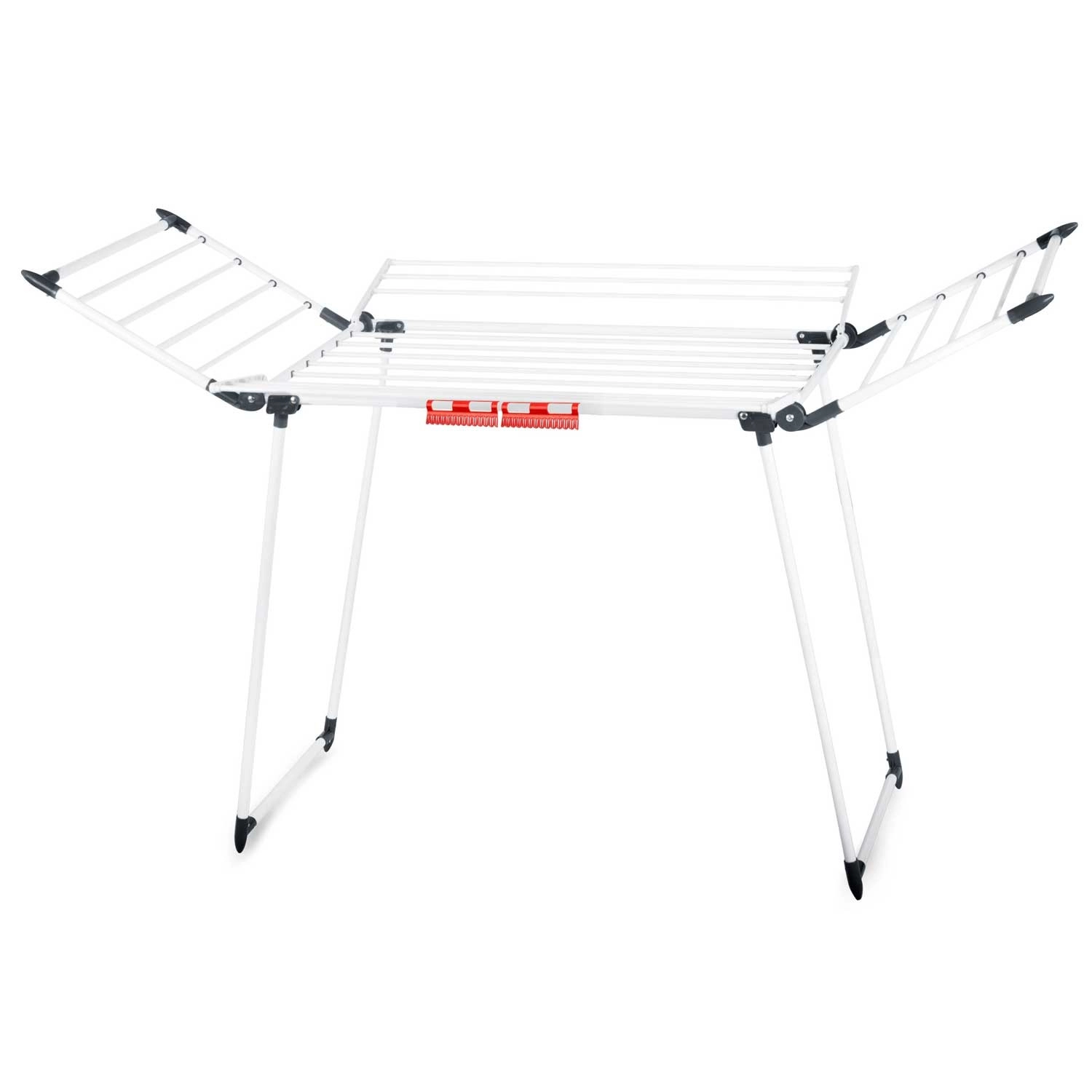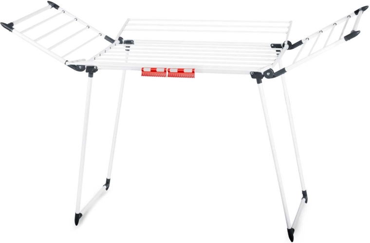4 udklappelige vinger udvider tørrefladen præcis, når du har brug for det, mens specielle holdere til undertøj og småt tøj sparer plads på hovedstængerne. Kraftige stænger hjælper desuden med at reducere krøl, så tøjet ofte slet ikke behøver at blive strøget.