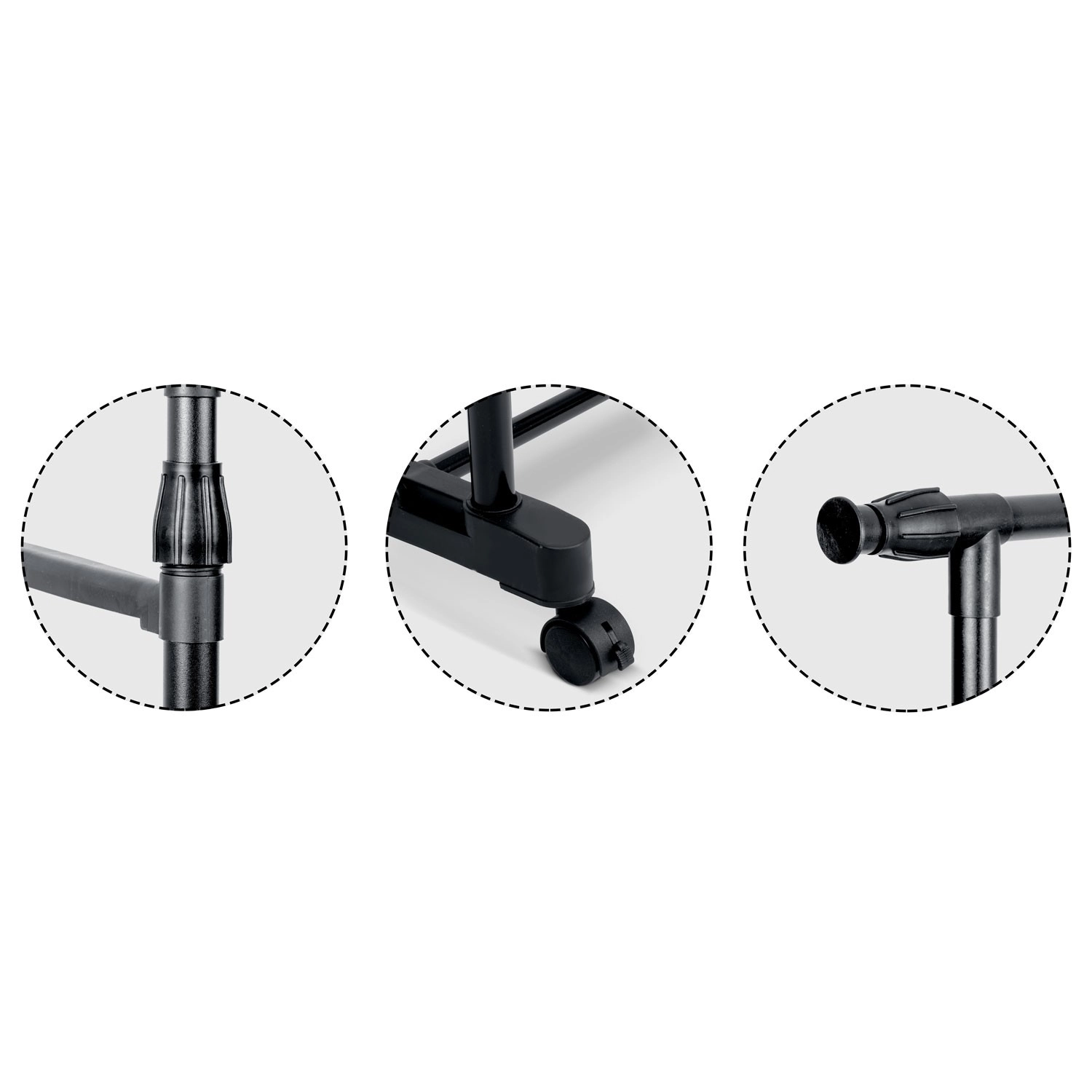Fire drejelige hjul sikrer jævn bevægelse i rummet. Indbygget lås holder stativet sikkert på plads, når du hænger tøj op.