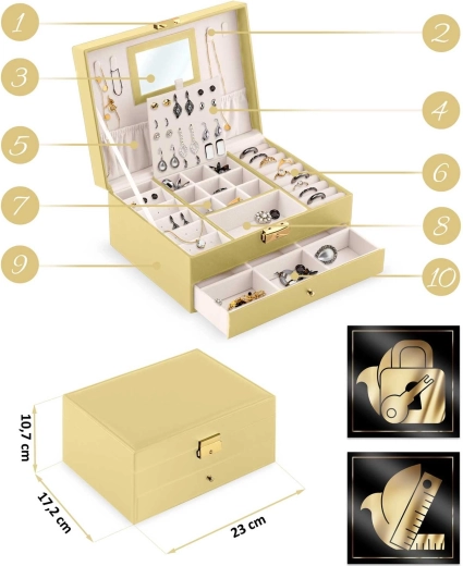 Takket være de kompakte mål 23 × 17,2 × 10,7 cm placeres det nemt på toilettetbordet eller i en skuffe. Låget med spejl suppleres af kroge til halskæder med elastisk lomme, øverste niveau rummer rækker til ringe og adskilte rum, og nederst findes en udtræksskuffe med flere skillevægge. Det holdbare PU-økoskind er let at vedligeholde og ser godt ud i længden.