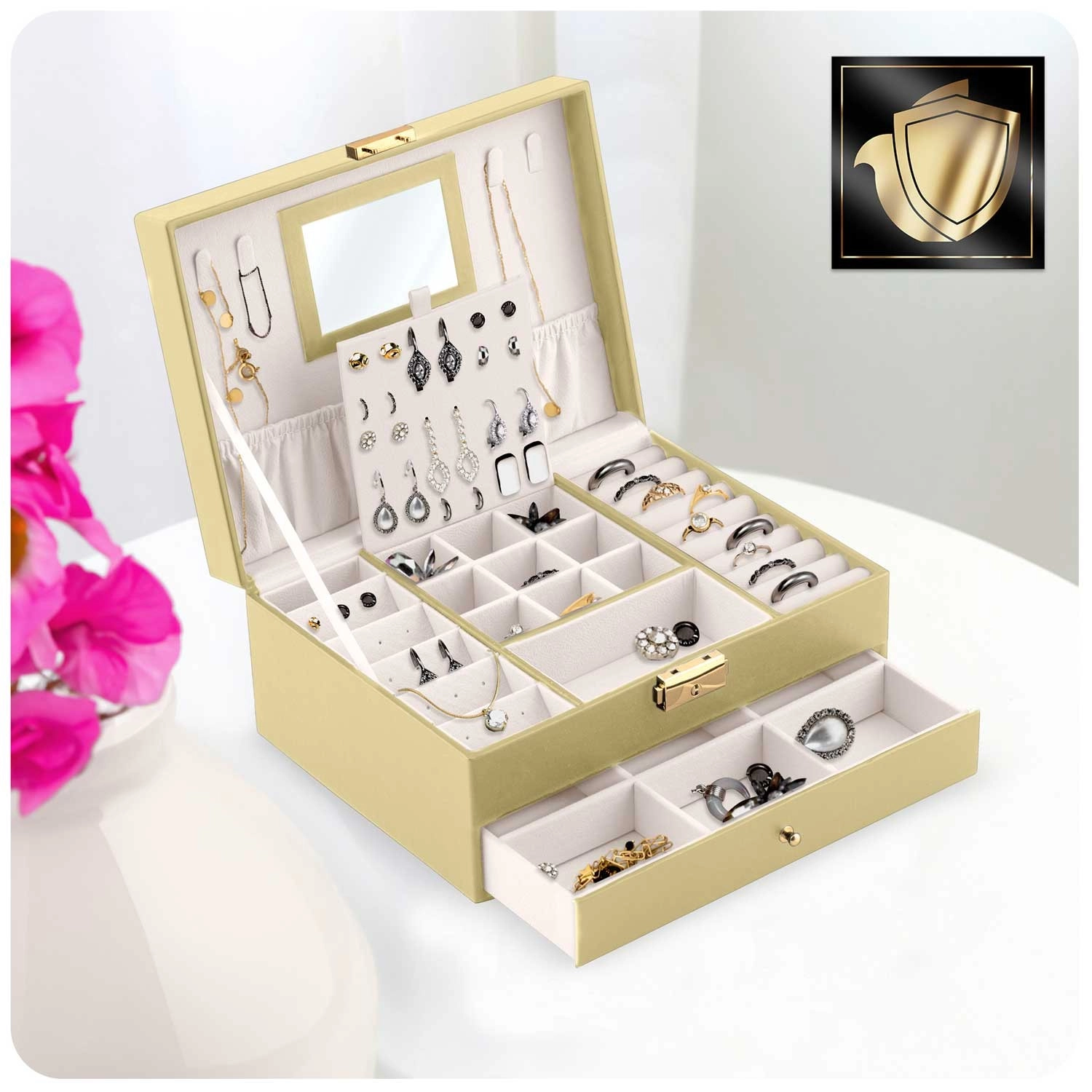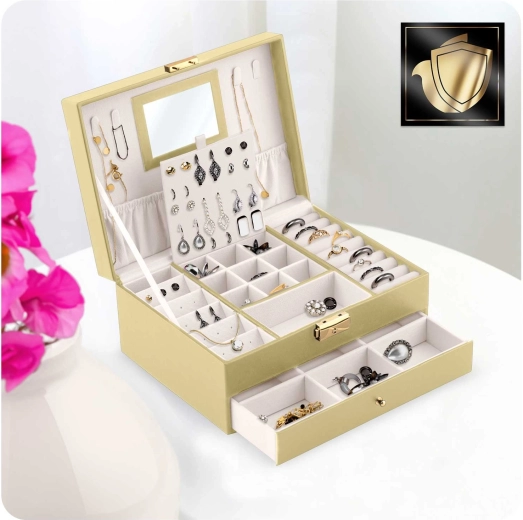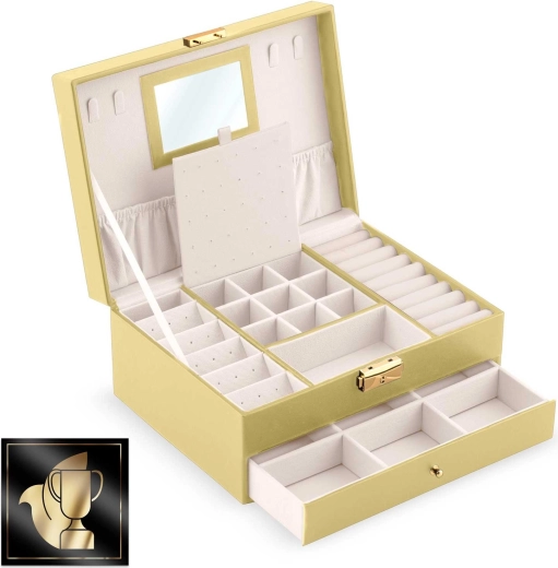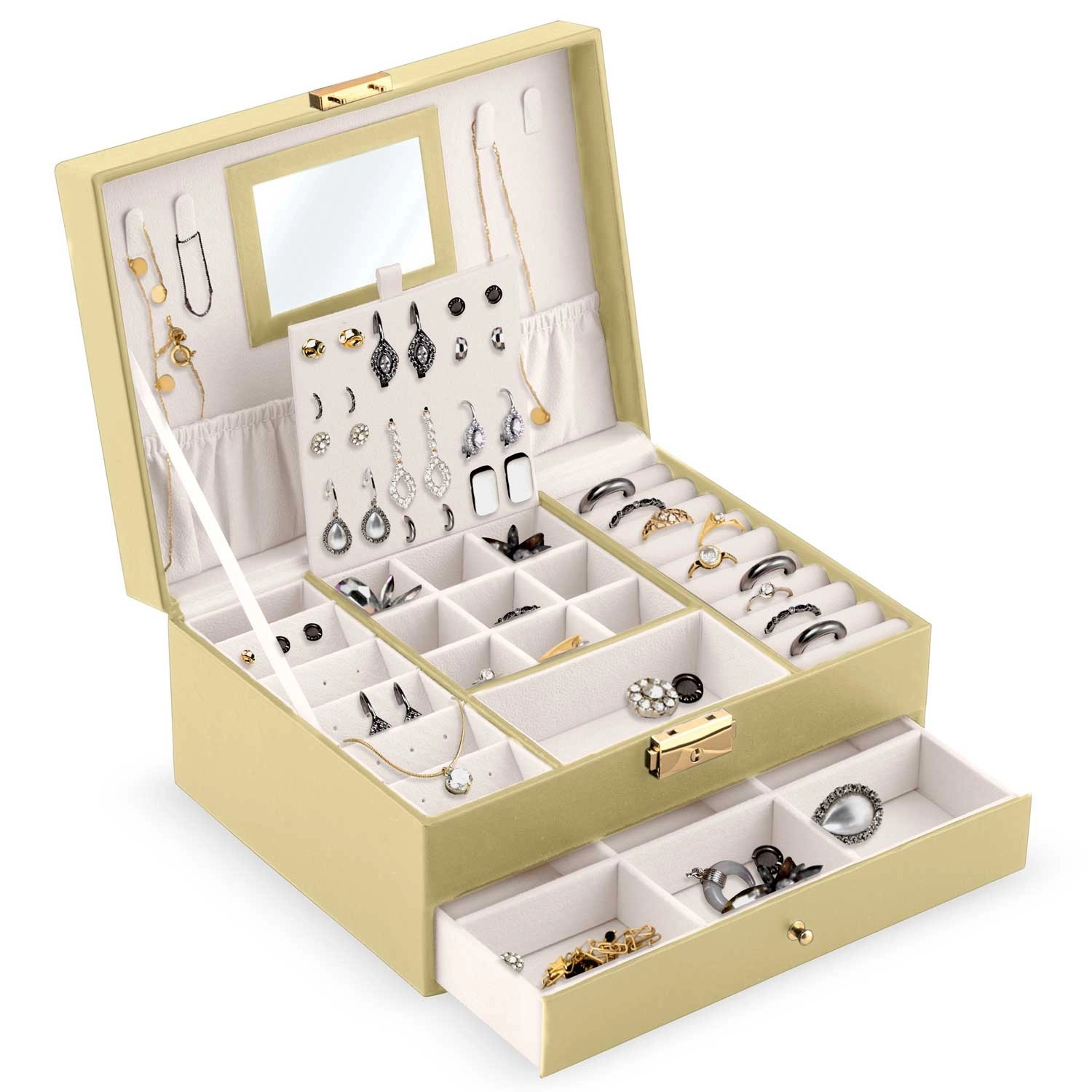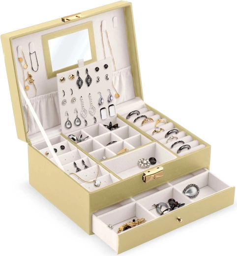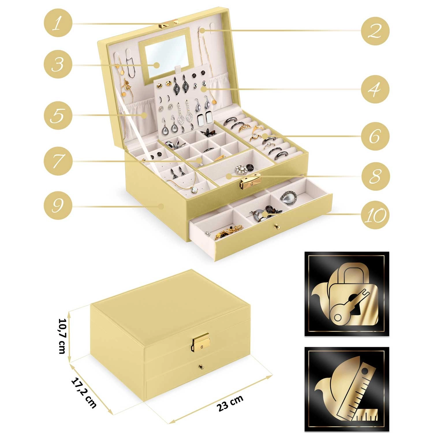 - Spejl i låget, kroge til halskæder, elastisk lomme, plade til øreringe, ruller til ringe, praktiske rum, udtræksskuffe med skillevægge