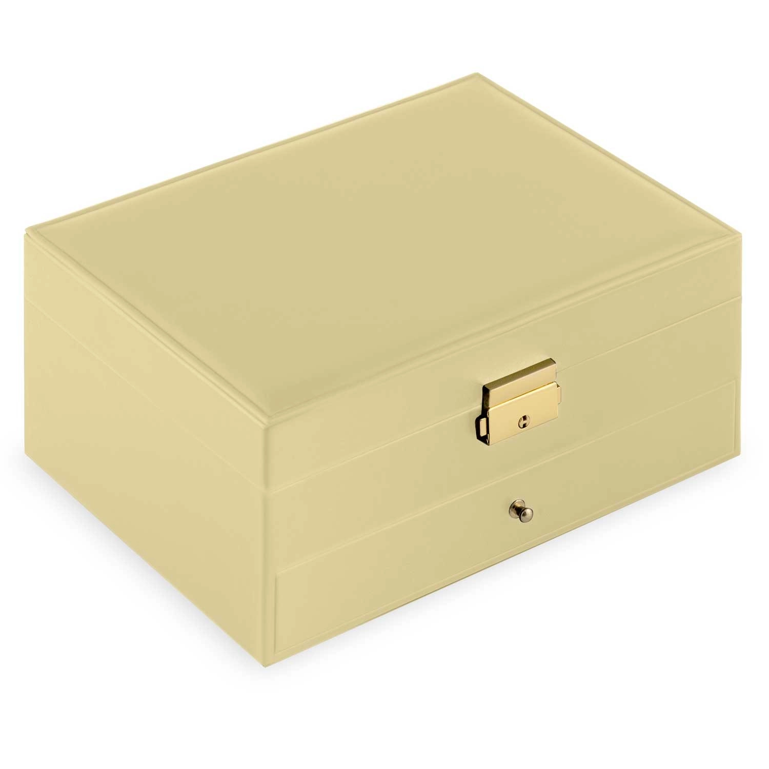 Oplev kombinationen af stil, funktionalitet og beskyttelse. Dette gyldne MASSIDO-smykkeskrin tilbyder en gennemtænkt indretning til overskuelig opbevaring af hele samlingen – fra fine øreringe til markante armbånd. Den låsbare lukning forhindrer utilsigtet åbning, og den bløde foring beskytter skånsomt smykkernes overflade.