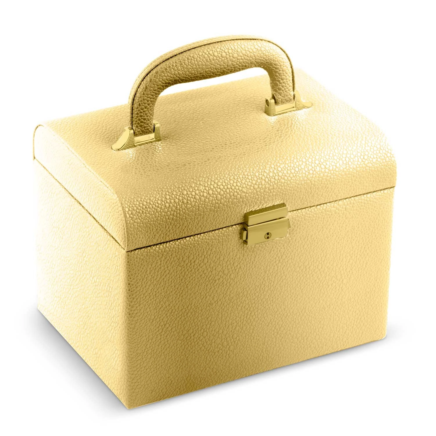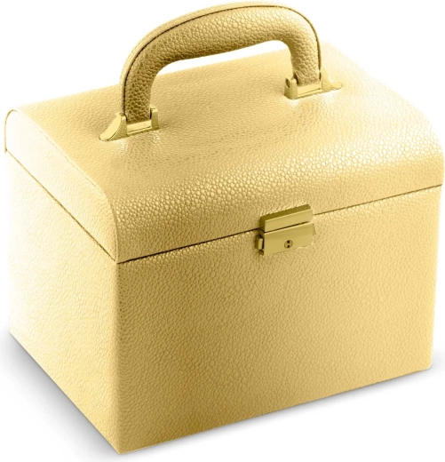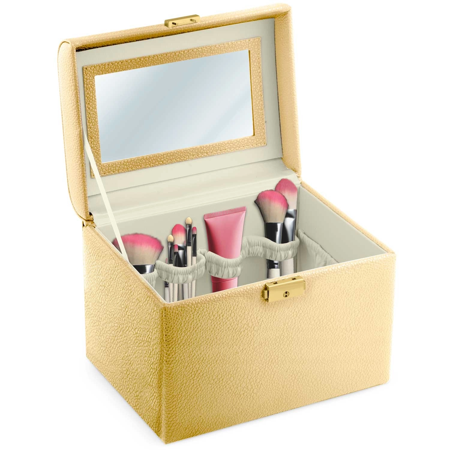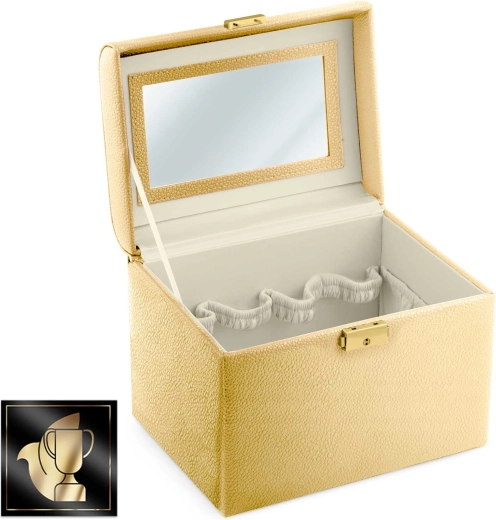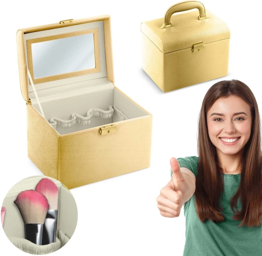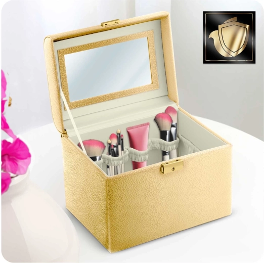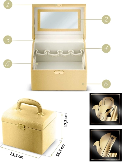 Den gyldne kosmetikboks MASSIDO MS-706 kombinerer stil, holdbarhed og maksimal funktionalitet. De kompakte mål 22,5 × 16,5 × 17,2 cm passer nemt på sminkebordet og i rejsetasken, men rummer alligevel overraskende meget plads til kosmetik, smykker og tilbehør. Det integrerede spejl og det organiserede interiør gør hurtig makeup og perfekt orden mulig når som helst og hvor som helst.