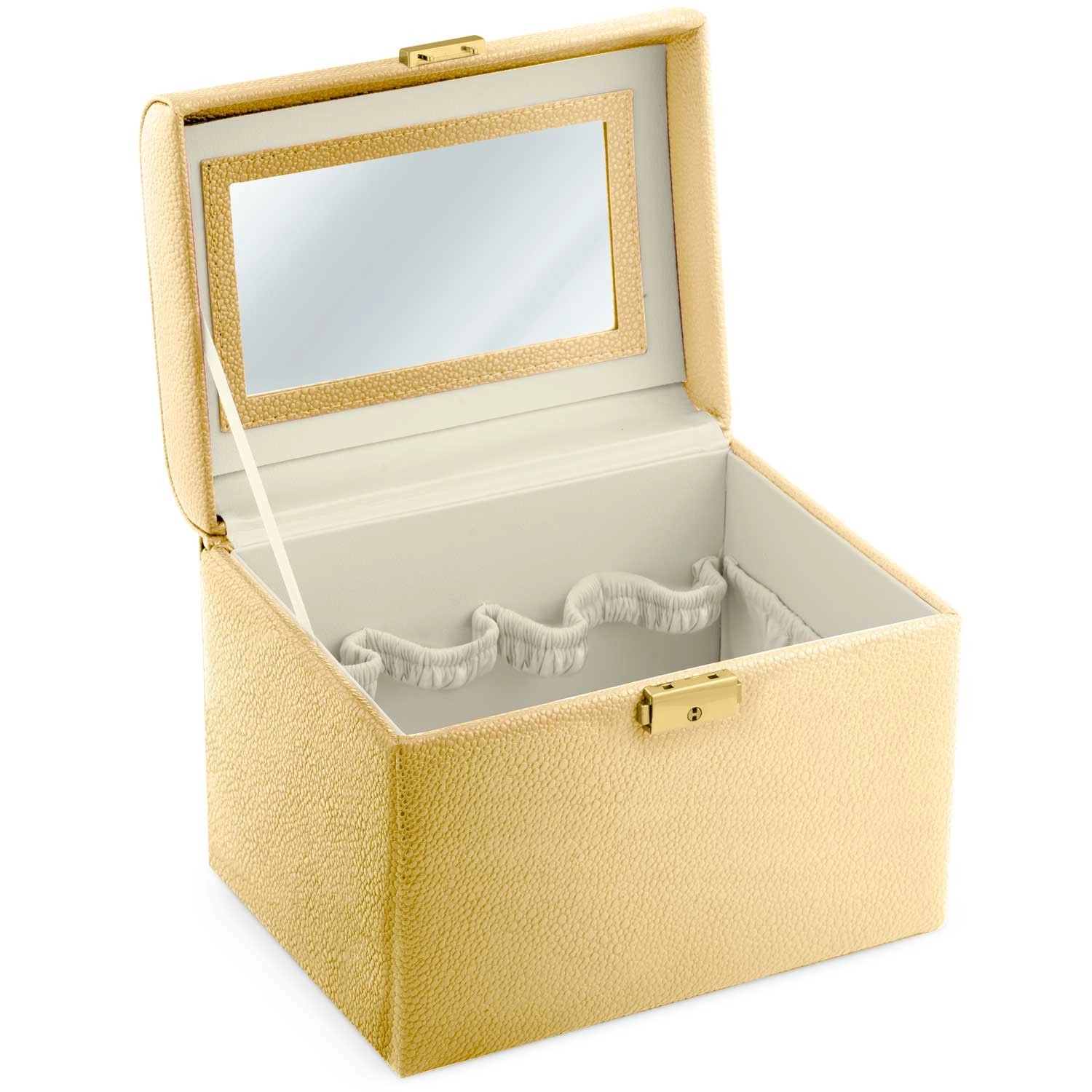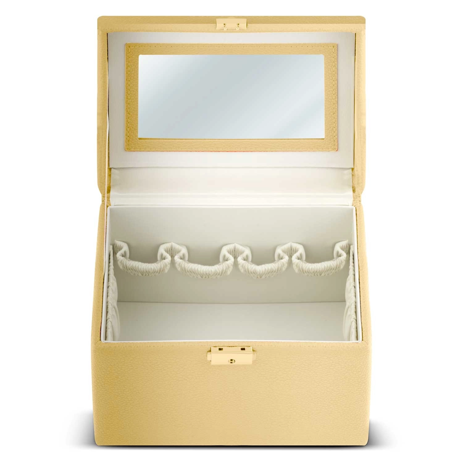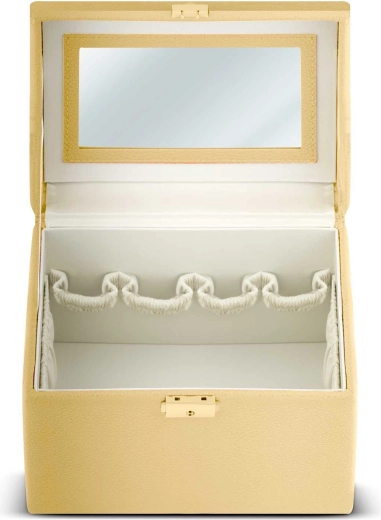 Boksen kan låses med nøgle, og på indersiden af låget er der et praktisk spejl til hurtige justeringer både hjemme og på rejsen.