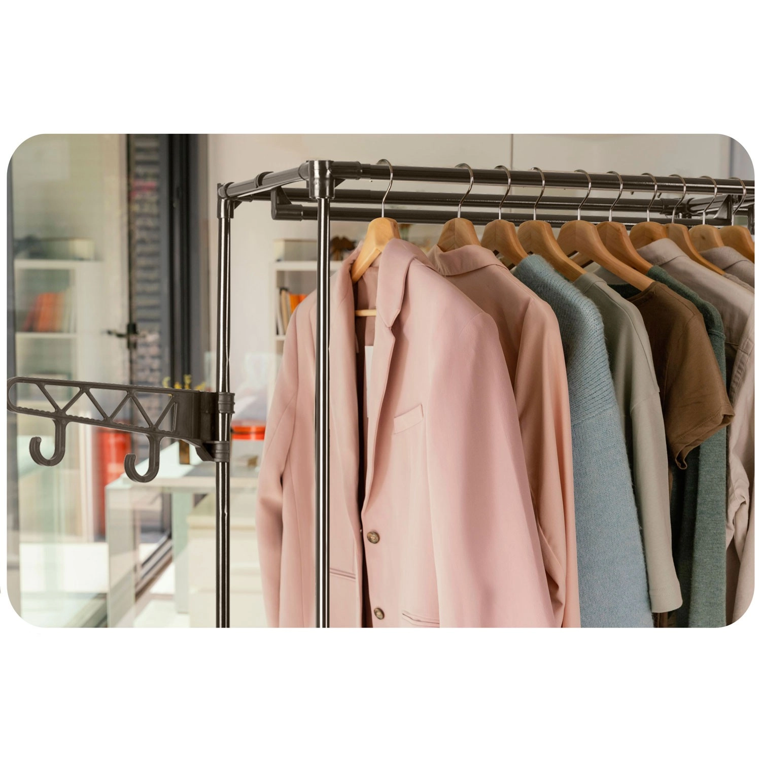 Praktiske sidekroge rummer tasker, hatte eller håndklæder og frigør plads på hovedstængerne.