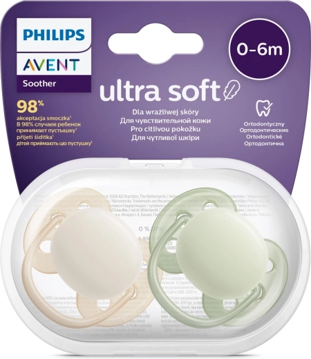 Philips Avent Ultrasoft Premium sutten er udviklet til sart babyhud. Takket være den ekstra bløde og fleksible skive tilpasser den sig skånsomt ansigtets konturer og hjælper med at forebygge mærker og rødme. Den ortodontiske, symmetriske form i blød silikone støtter en sund udvikling af gane, tænder og gummer.