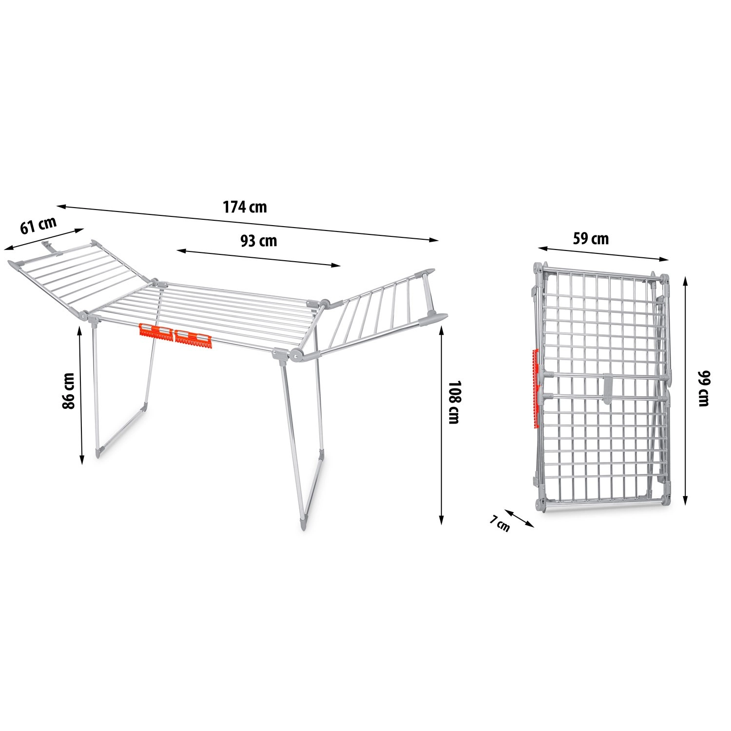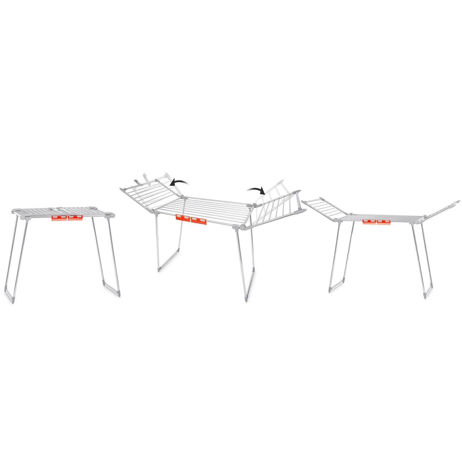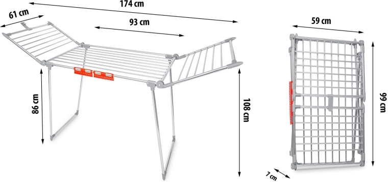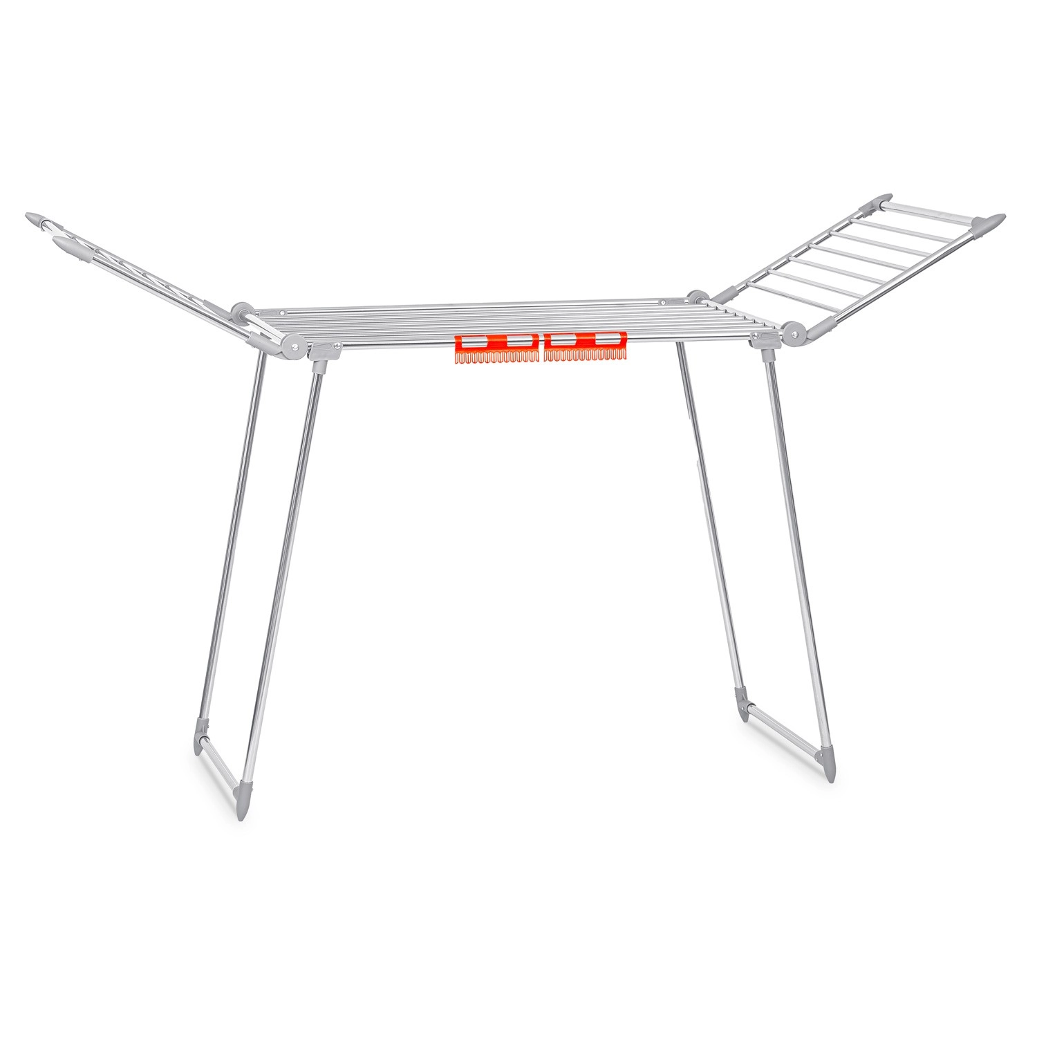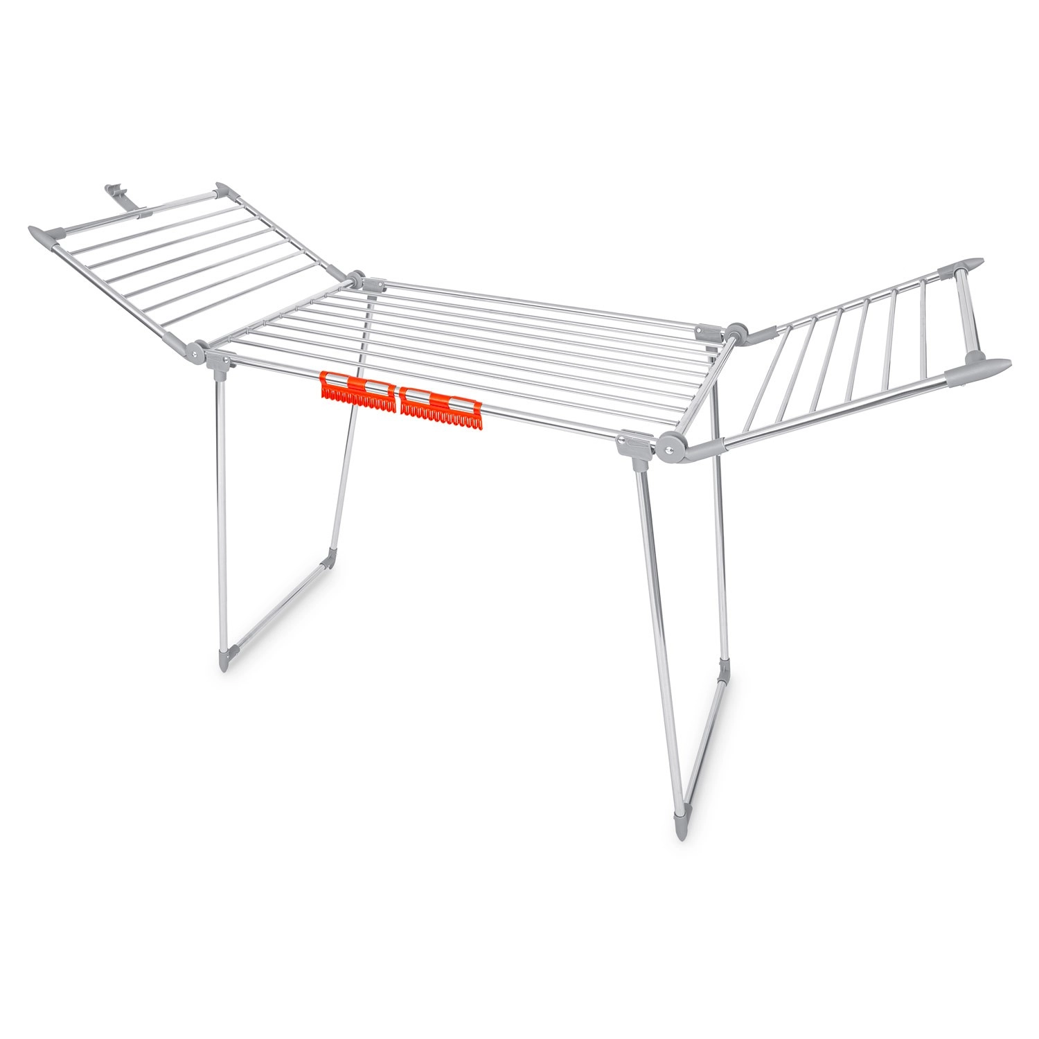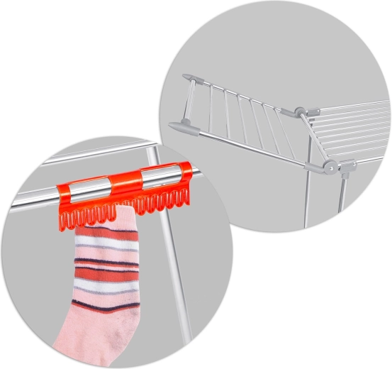 Praktisk sammenklappeligt tørrestativ i rustfrit stål med tørrekapacitet på 19 m og to udklappelige vinger for ekstra plads. Udstyret med holdere til småt tøj (sokker, undertøj), stabil metalramme og skridsikre fødder. Takket være kraftigere stænger reduceres unødige folder, og tøjet tørrer hurtigere og mere jævnt. Enkel og hurtig sammenklapning og udklapning sparer plads i enhver husstand.