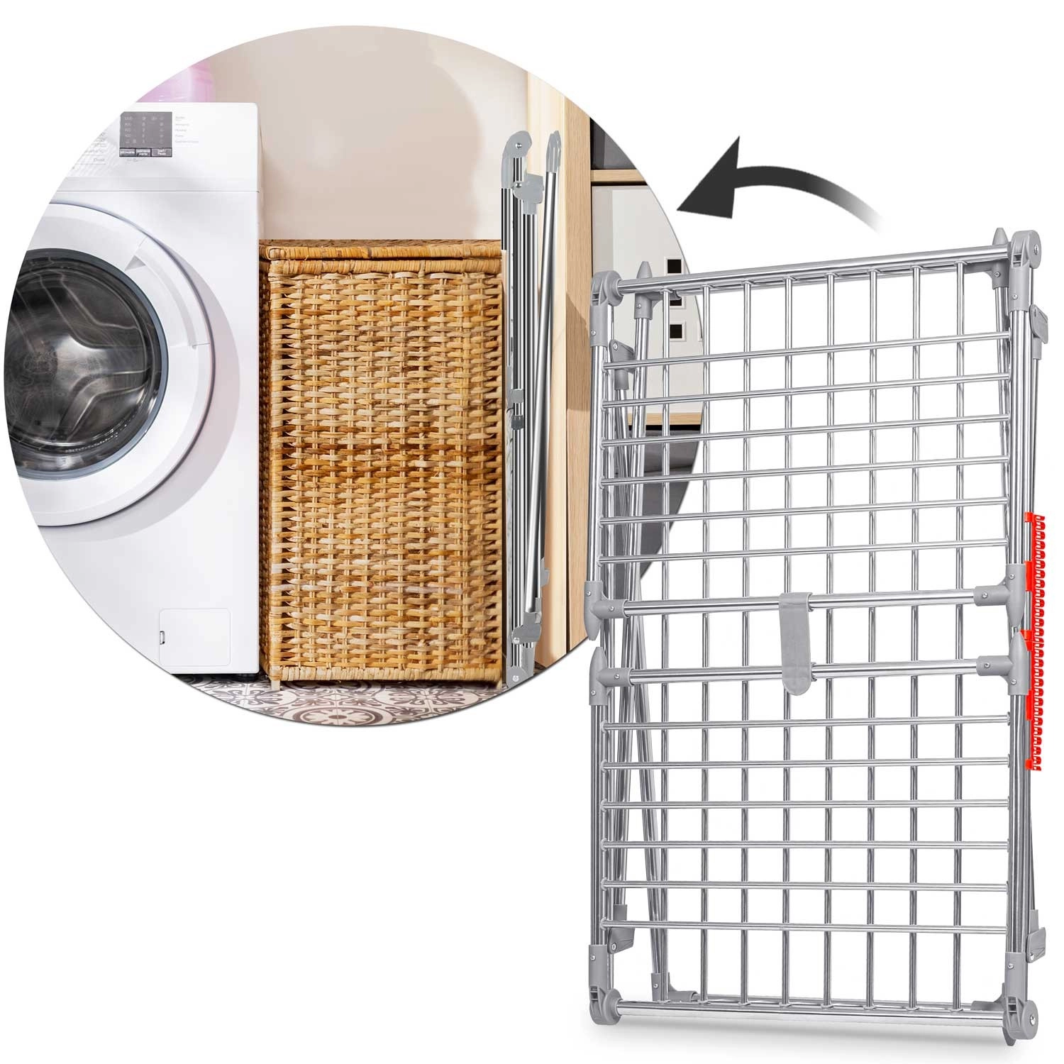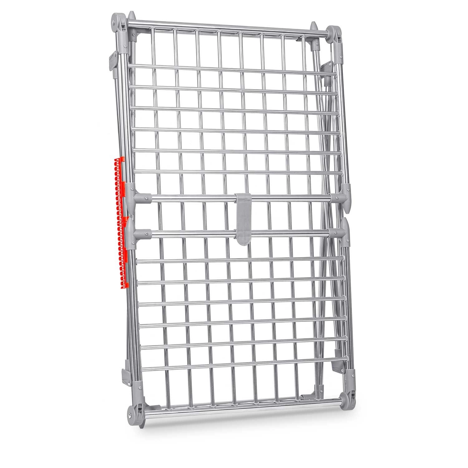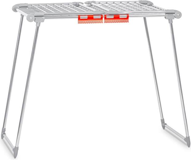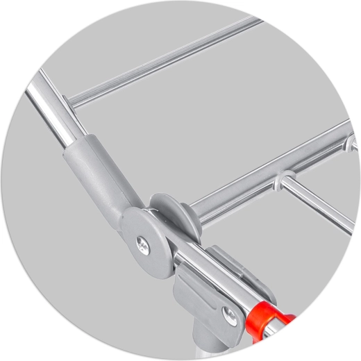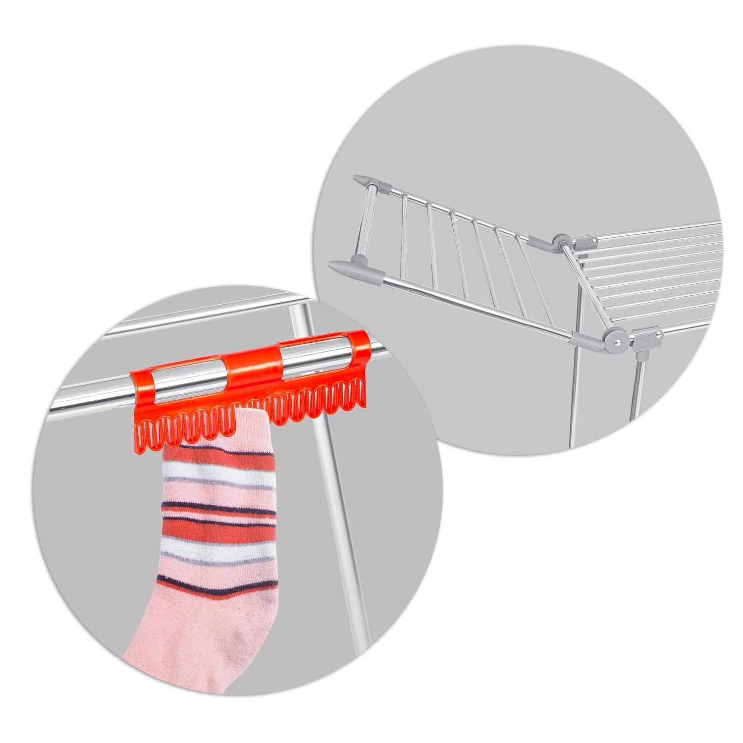 Praktisk sammenklappeligt tørrestativ i rustfrit stål med tørrekapacitet på 19 m og to udklappelige vinger for ekstra plads. Udstyret med holdere til småt tøj (sokker, undertøj), stabil metalramme og skridsikre fødder. Takket være kraftigere stænger reduceres unødige folder, og tøjet tørrer hurtigere og mere jævnt. Enkel og hurtig sammenklapning og udklapning sparer plads i enhver husstand.