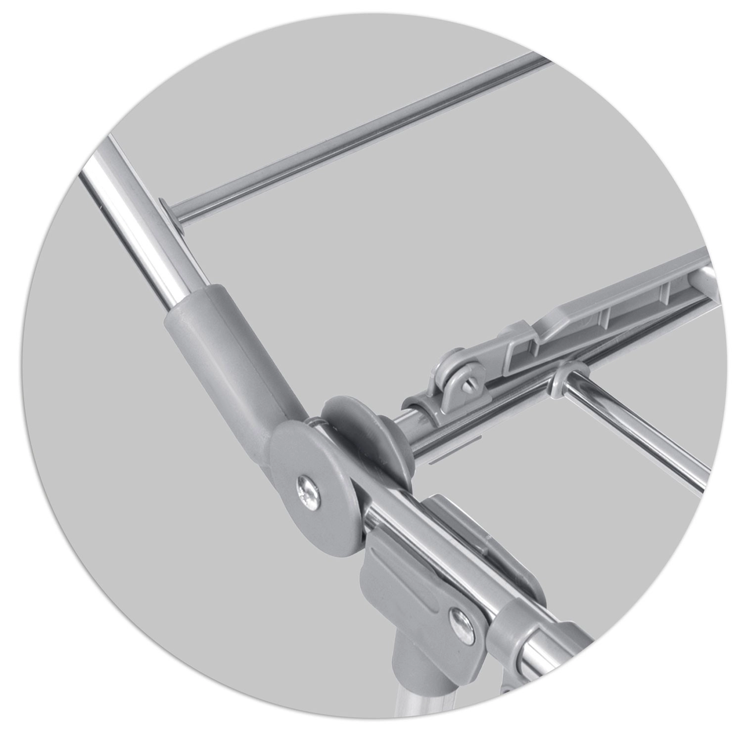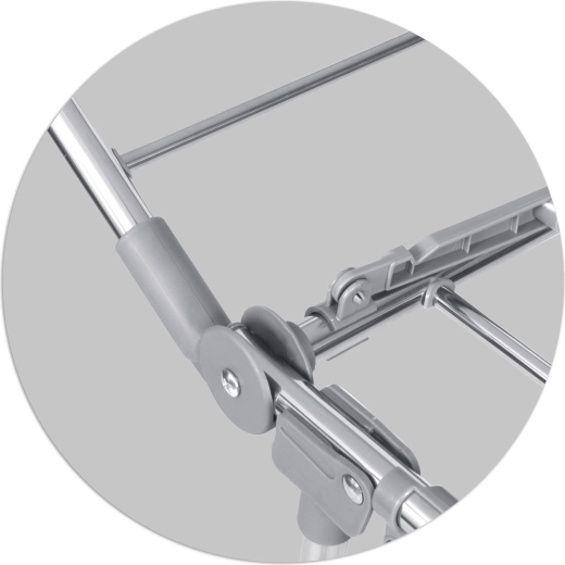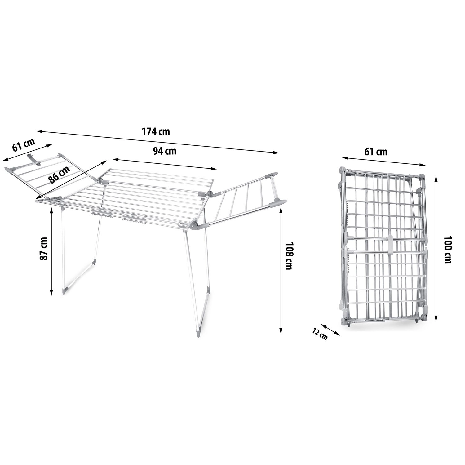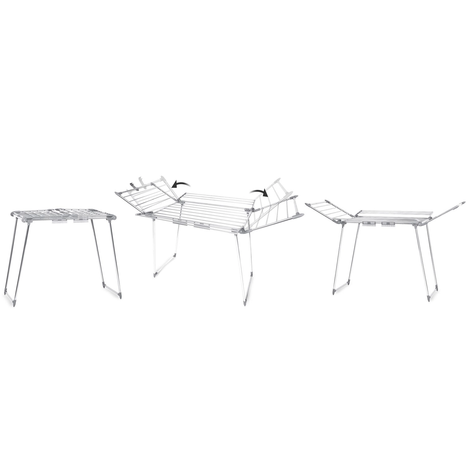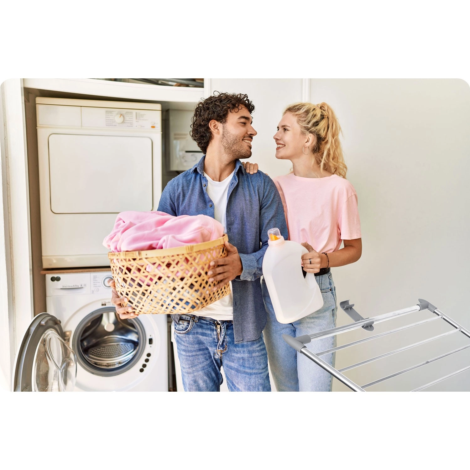 Med 4 udklappelige vinger og en samlet snorlængde på op til 22 meter tørrer du nemt en almindelig ugentlig mængde vasketøj. Holdere til undertøj og småting sparer plads på hovedstængerne og holder alt overskueligt samlet ét sted. Konstruktionen er stabil, men sammenklappelig og kompakt – efter brug skubber du den nemt ind ved siden af vaskemaskinen eller i en smal sprække.