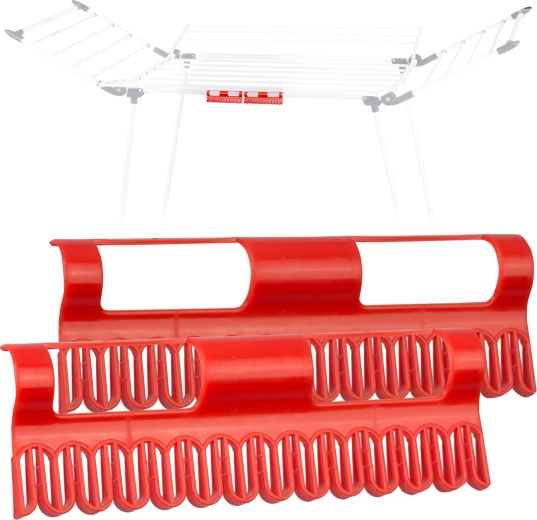 Maksimér pladsen på tørrestativet og tør småting smart. De røde holdere med fleksible åbninger fastholder sikkert sokker, undertøj eller børnetøj uden klemmer. Takket være bedre luftcirkulation opnås hurtigere og mere skånsom tørring, hvilket bidrager til længere levetid for materialet.