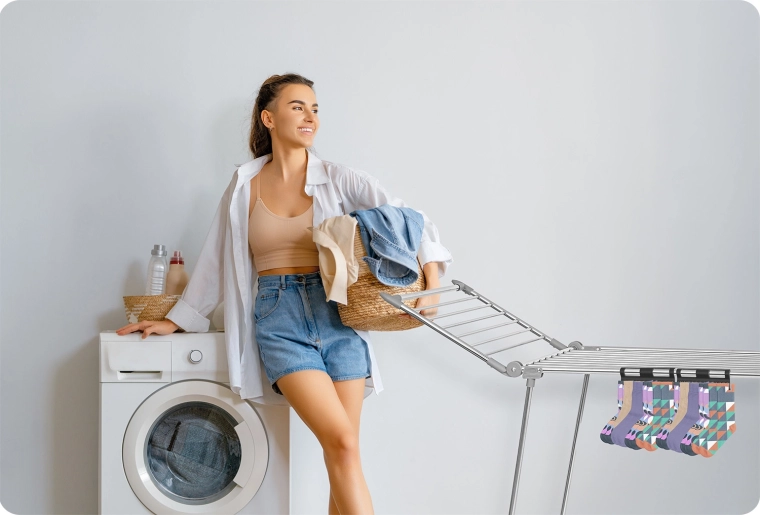 - Mere plads på tørrestativet: sokkerne hænger i siderne, og hovedfladen forbliver fri.