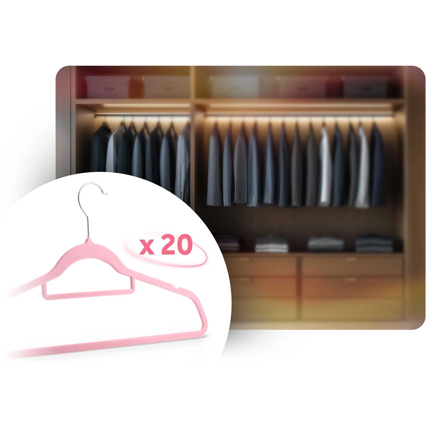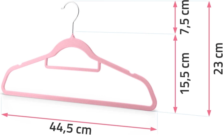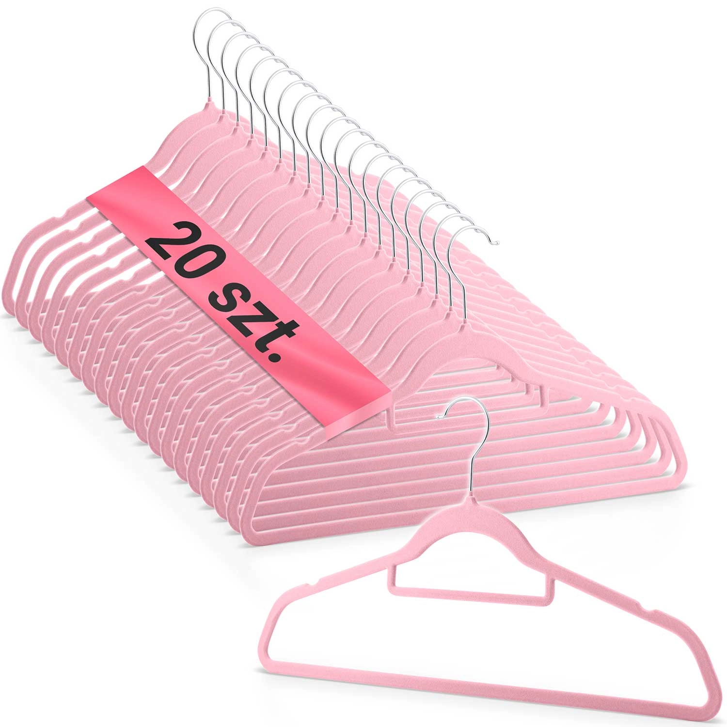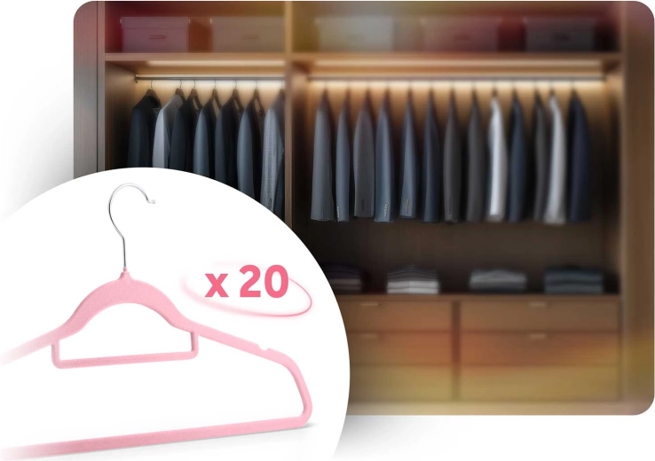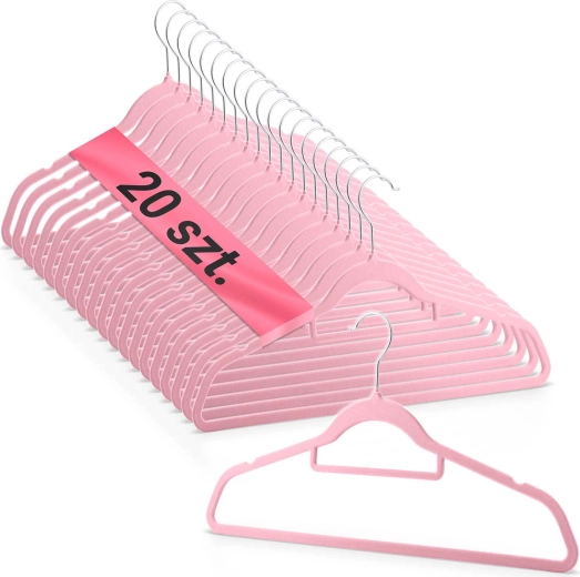 Et stilfuldt og praktisk sæt med 20 bøjler hjælper dig hurtigt med at få styr på skabet. Den skridsikre velour forhindrer, at sarte materialer glider, mens den gennemtænkte form med udskæringer på skuldrene holder også toppe med tynde stropper. Den roterbare stålkrog gør sortering og ophængning nem uden unødig anstrengelse.