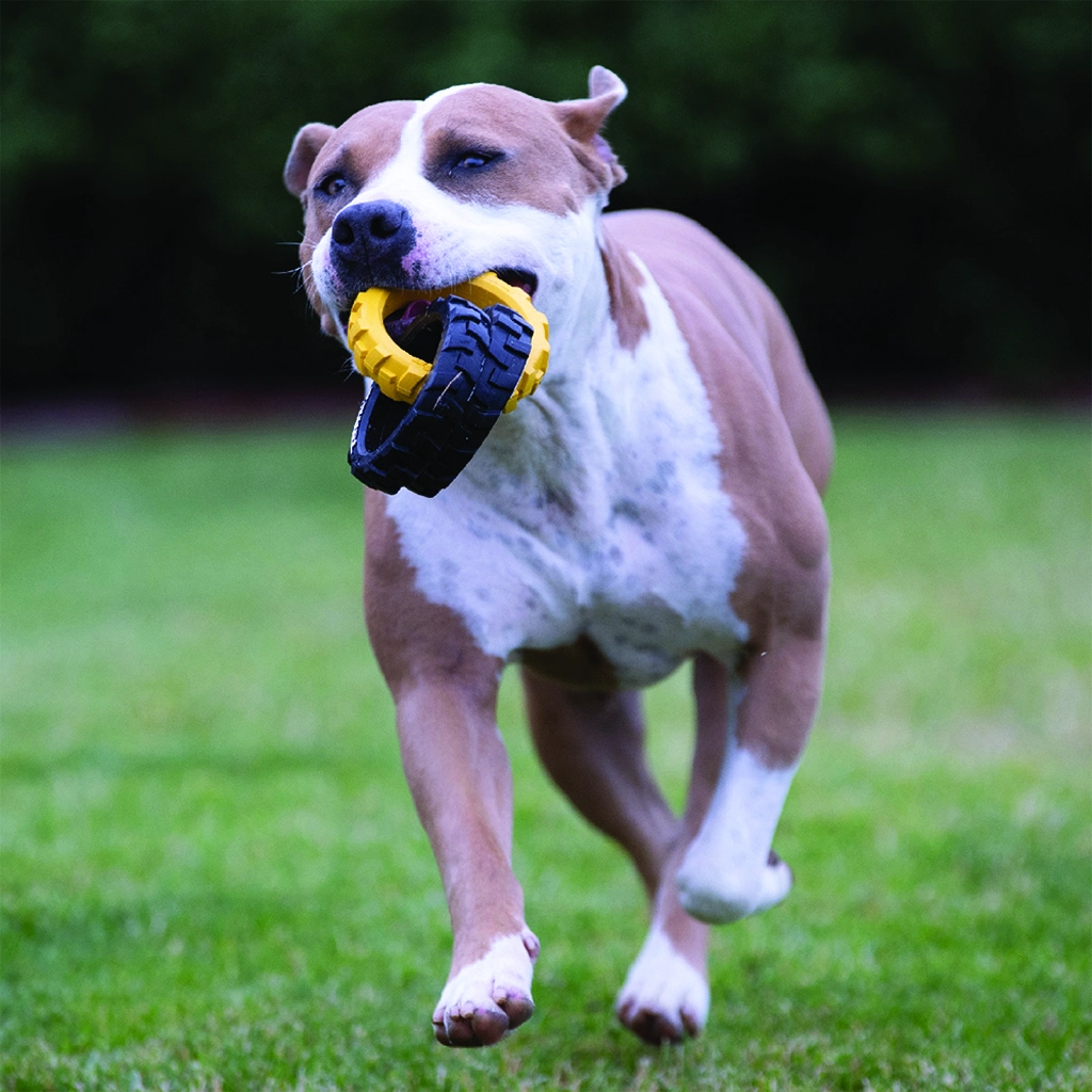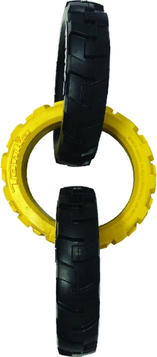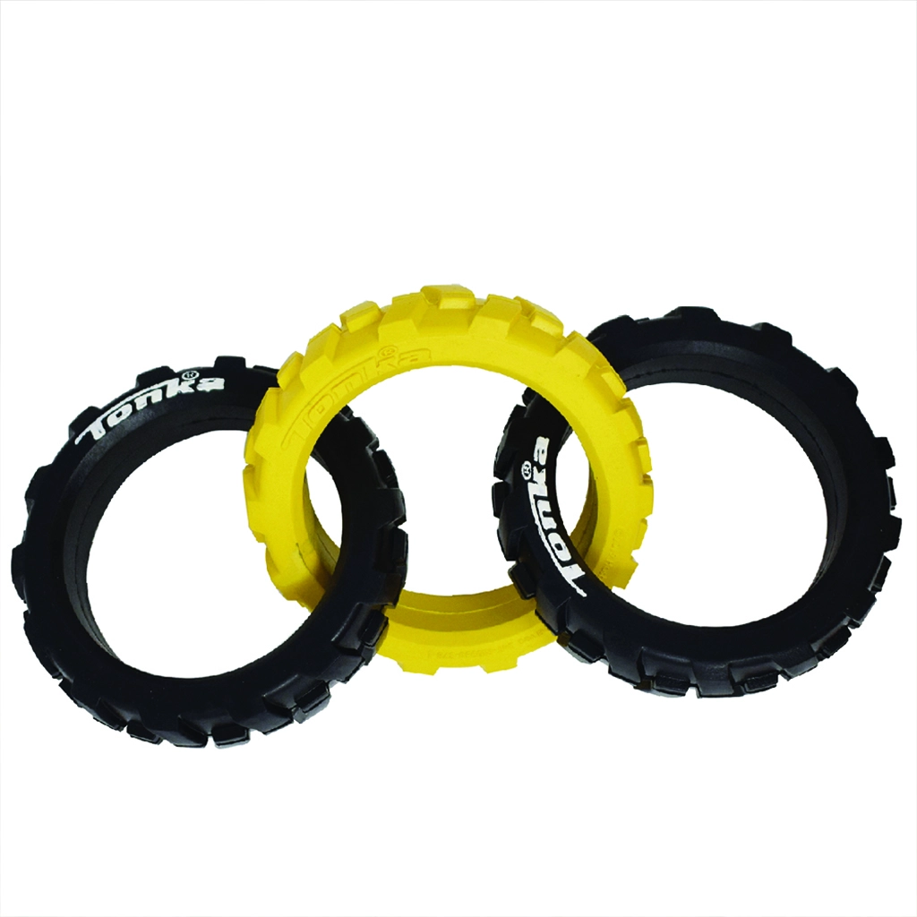 Tonka-legetøjet består af tre robuste ringe med et fleksibelt, dæk-lignende mønster, der ligger godt i både hundens mund og i hånden. Kombinationen af holdbar gummi og smart form klarer intens trækleg og er samtidig sikker til daglig underholdning.