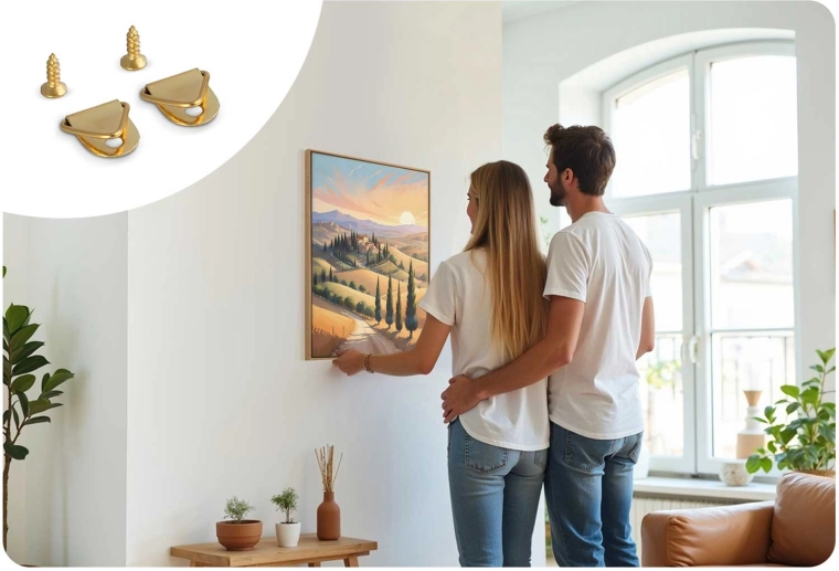 - Sæt med kroge og elementer til ophængning af det færdige billede