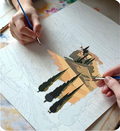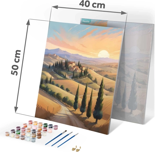 Oplev glæden ved at skabe med et kvalitetskit til maling efter tal 40 × 50 cm fra Massido. Solidt lærred på ramme, farvet underlag for nemmere orientering, op til 30 dækkende akrylfarver, 3 præcise pensler og et sæt ophængskroge – alt, hvad du behøver for et smukt landskabsbillede, selv hvis du er nybegynder.