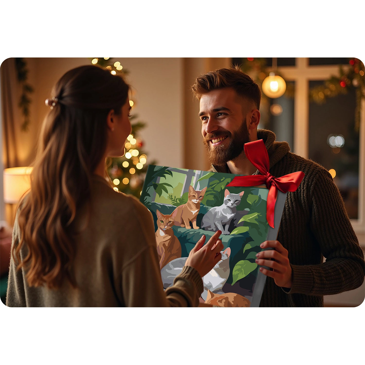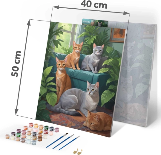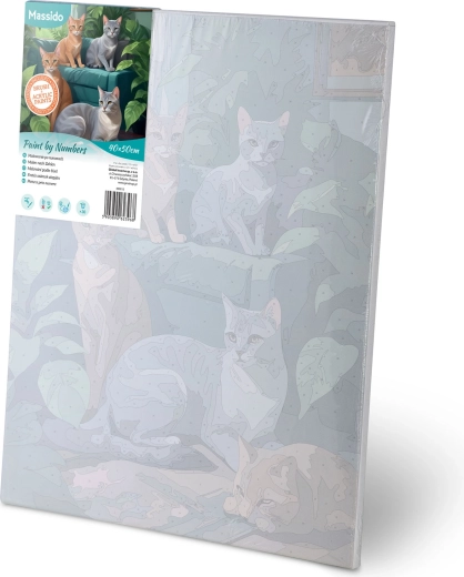 Skab dit eget vægbillede med et legende kattemotiv blandt grønne planter. MASSIDO-sættet til maling efter tal er perfekt til både begyndere og øvede – du skal blot matche farven til tallet og udfylde felterne trin for trin. Takket være farvet undertryk med fint mønster og afgrænsede kanter får du en sikker hånd og et flot resultat uden stress.