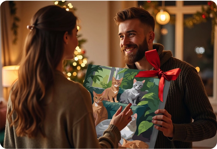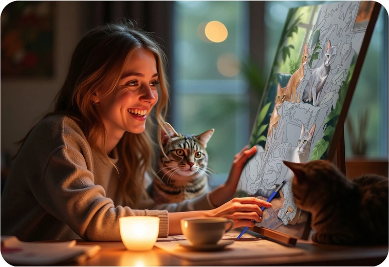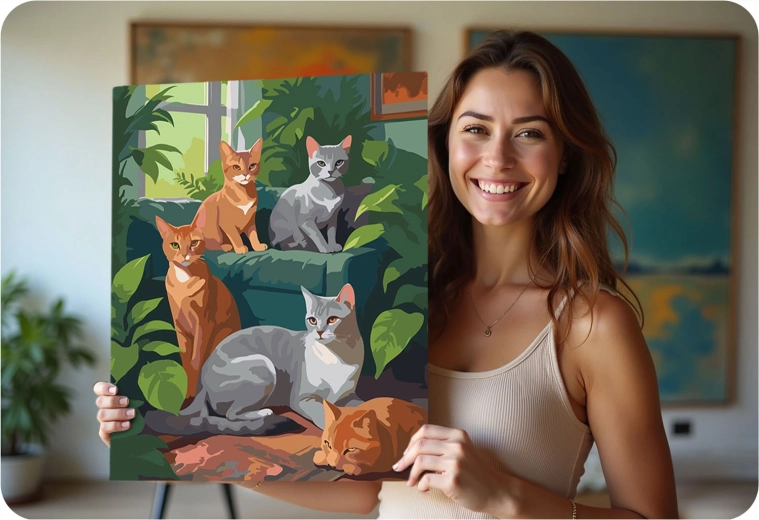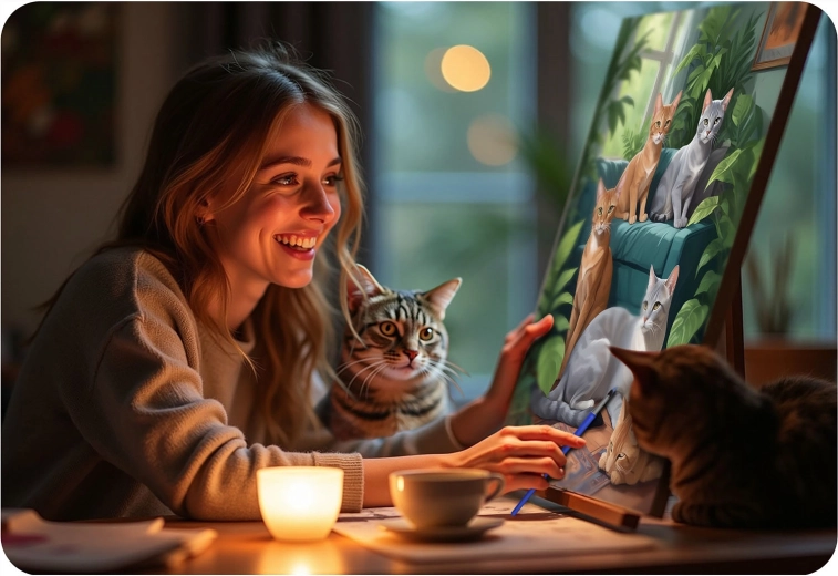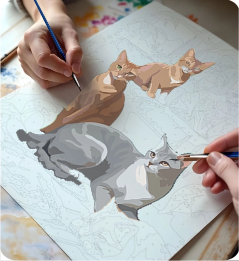 Ideelt kreativt projekt for både enkeltpersoner og familier. Det færdige billede med kattemotiv bliver en personlig pynt i hjemmet eller en gave fra hjertet.