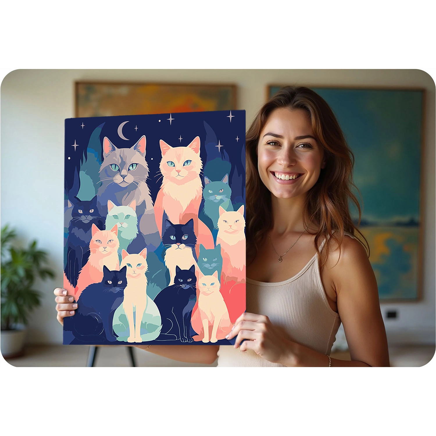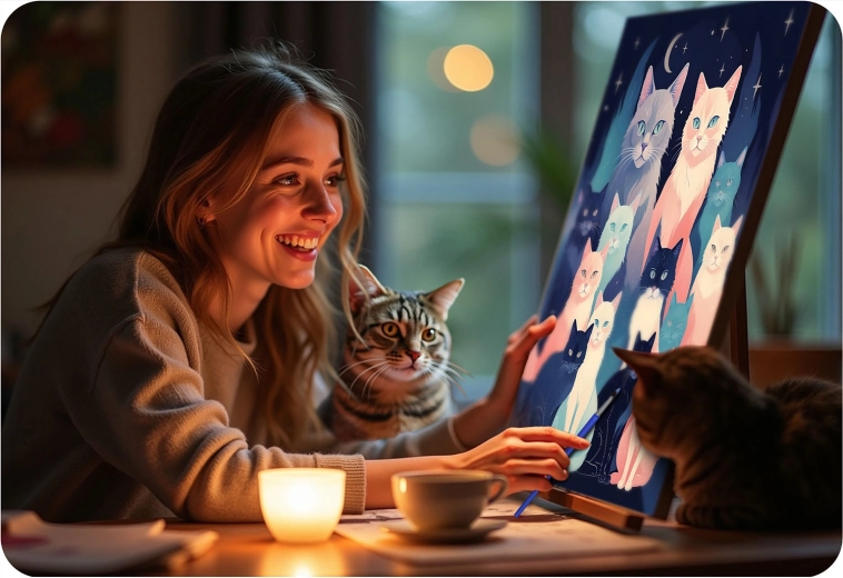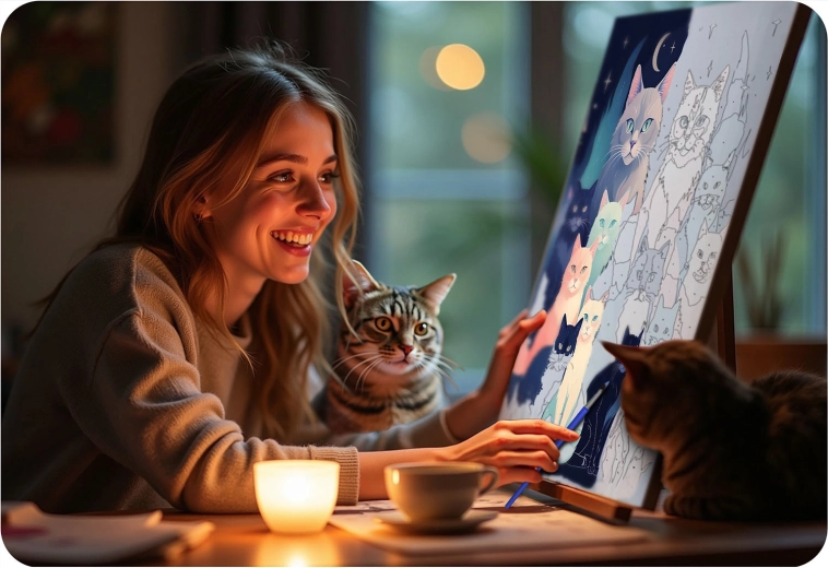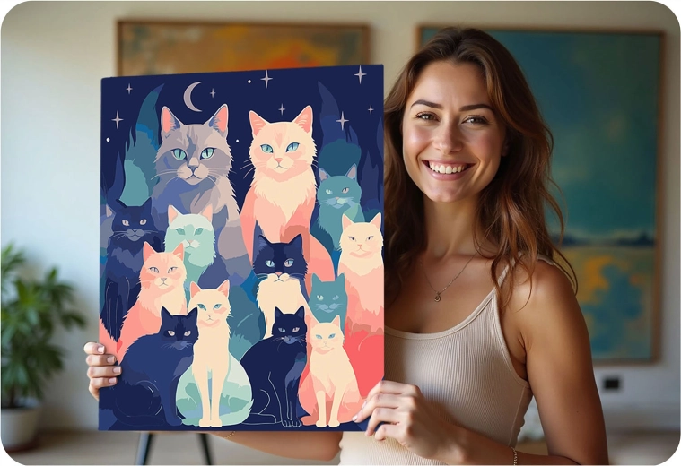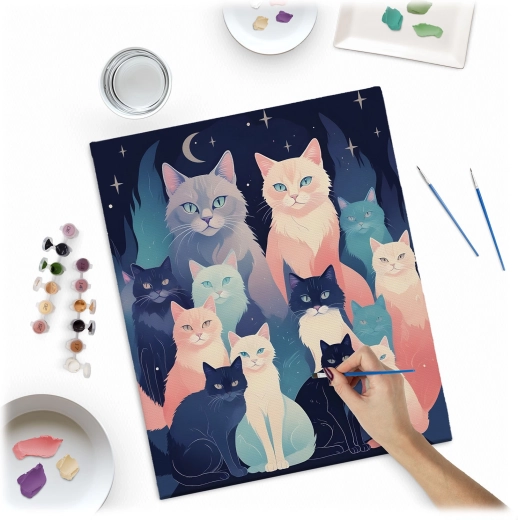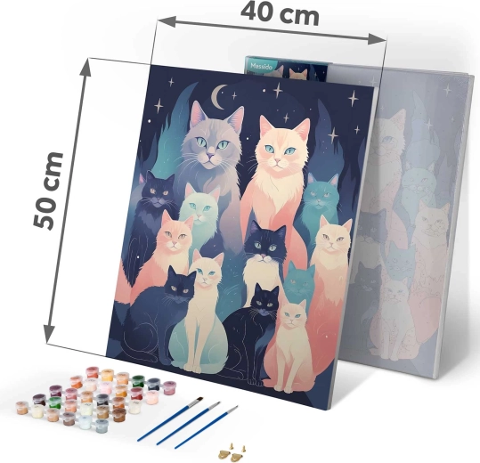 Slip tankerne fri og dyk ned i farvernes verden. Massido-sættet indeholder alt, hvad du behøver: et kvalitetslærred på træramme, overskuelige nummererede felter, intense og dækkende akrylfarver samt præcise pensler. Resultatet er et levende billede af katte på en mørkeblå baggrund, som vil pryde dit hjem eller glæde som gave.