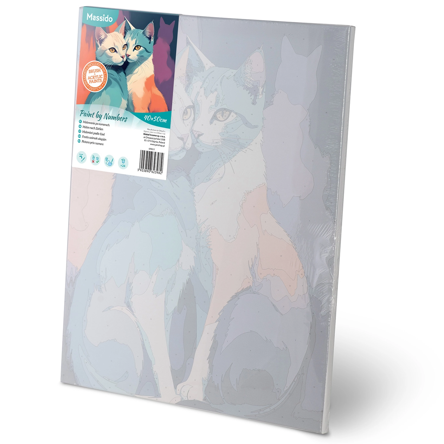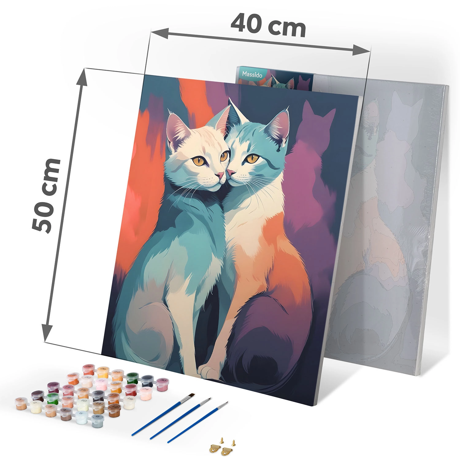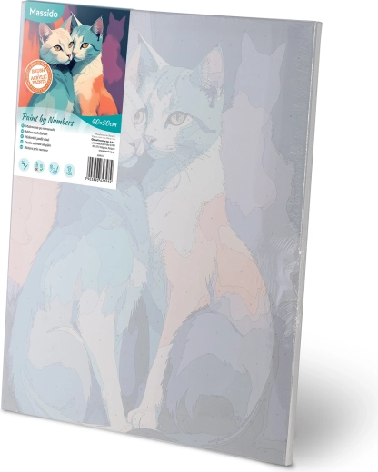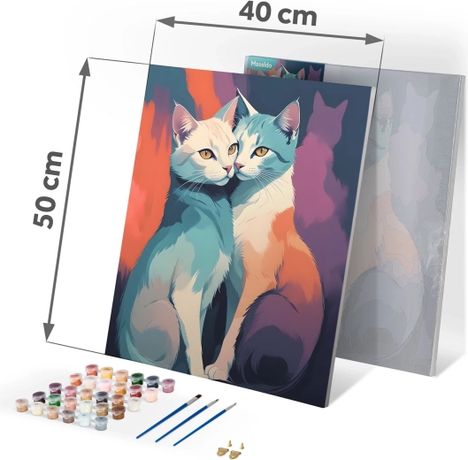 Opdag glæden ved at skabe med billedet Maler efter tal Massido i størrelsen 40 × 50 cm med motiv af katte. Du får et kvalitetslærred på ramme, 30 dækkende akrylfarver, 3 pensler gratis og kroge til ophæng. Takket være den farvede baggrund med fine linjer får selv komplette begyndere et smukt resultat.