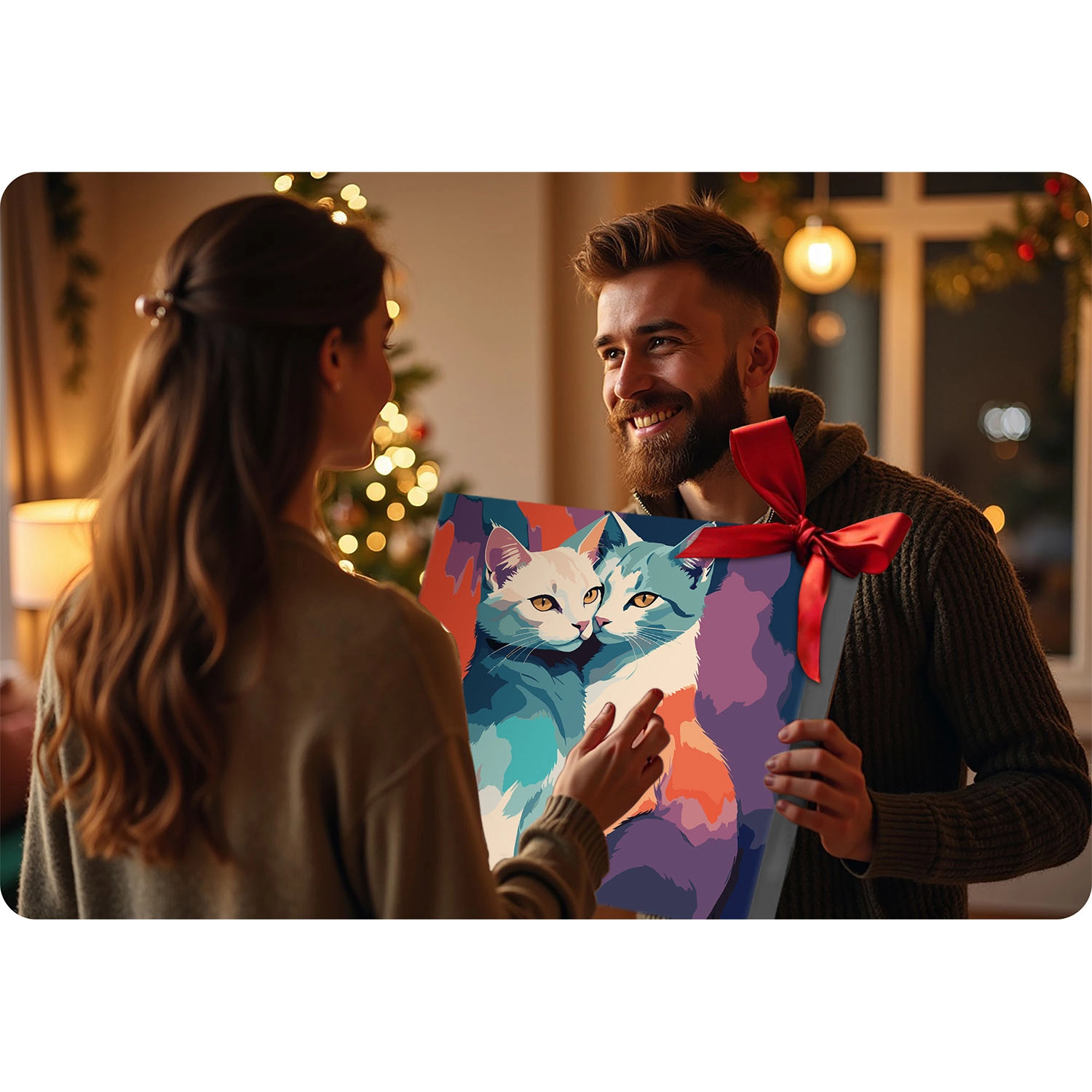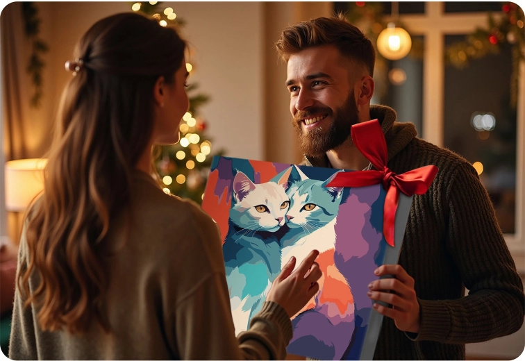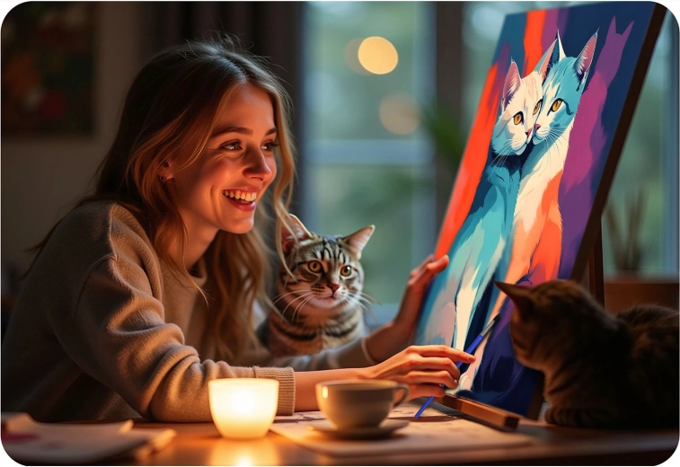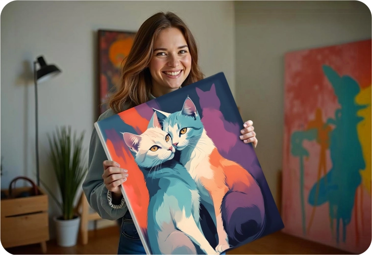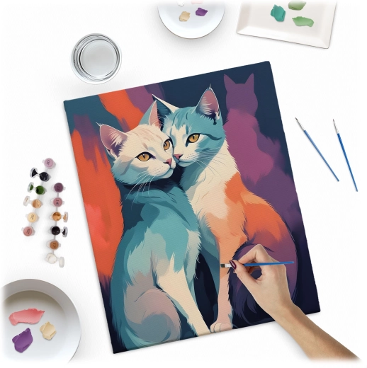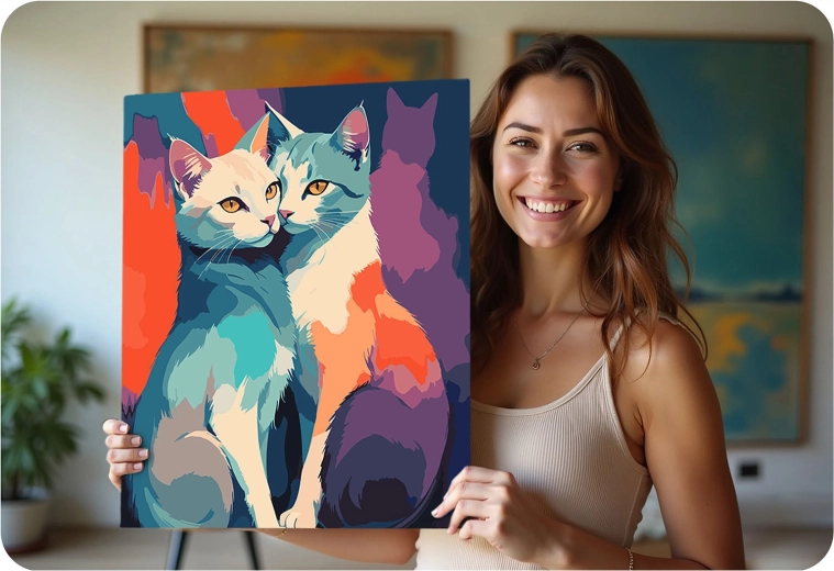 Et livligt, moderne kattemotiv, der lyser ethvert interiør op. Det færdige værk er en fantastisk dekoration og en personlig gave fra hjertet.