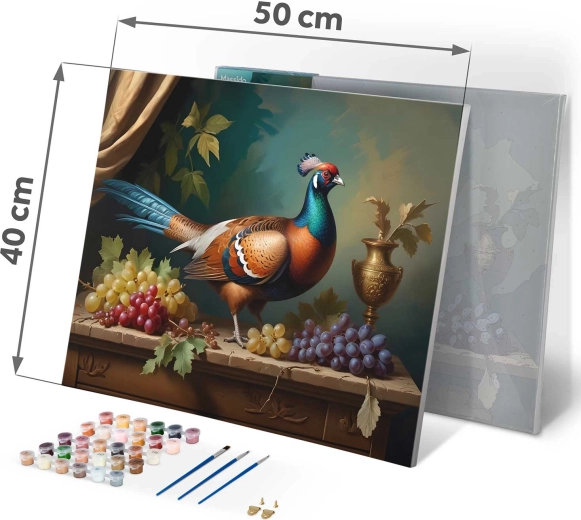Oplev skaberglæden med et komplet sæt til maling efter tal på et opspændt lærred 40 × 50 cm. Højkvalitets lærred på ramme, op til 30 dækkende akrylfarver, 3 pensler i forskellige størrelser og et sæt ophængskroge gør det nemt at male et imponerende billede af en farverig fasan i et klassisk stilleben – også for begyndere.
