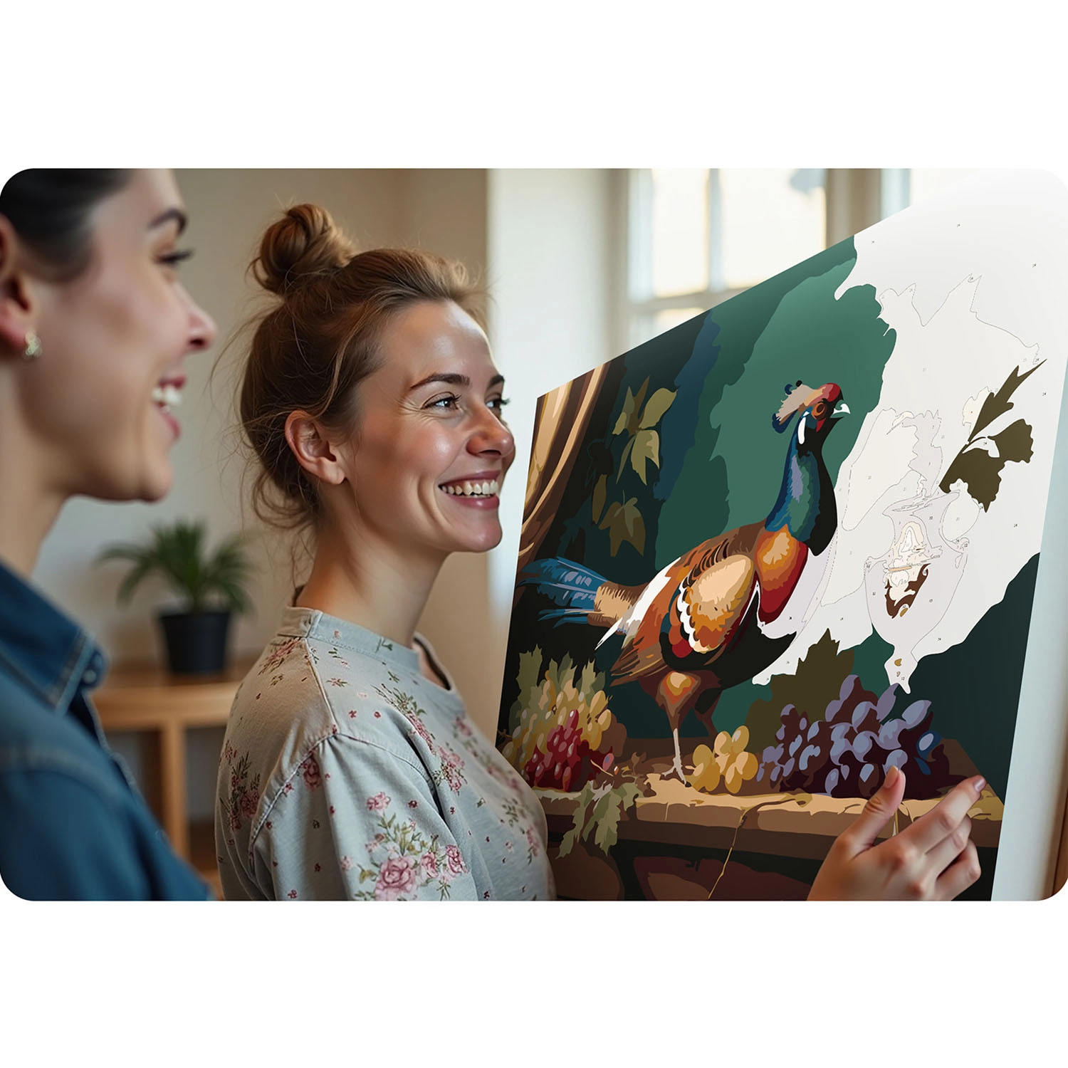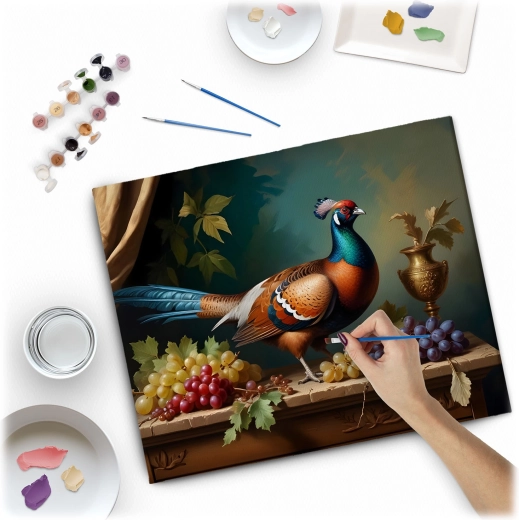 Skab dit eget kunstværk med motiv af en farverig fasan blandt druer og en vase. Det fortrykte, let tonede lærred med nummererede felter guider dig trin for trin til et perfekt resultat. Takket være de mættede og dækkende farver skinner linjerne ikke igennem, og billedet fremstår professionelt – uden behov for at fortynde farverne.