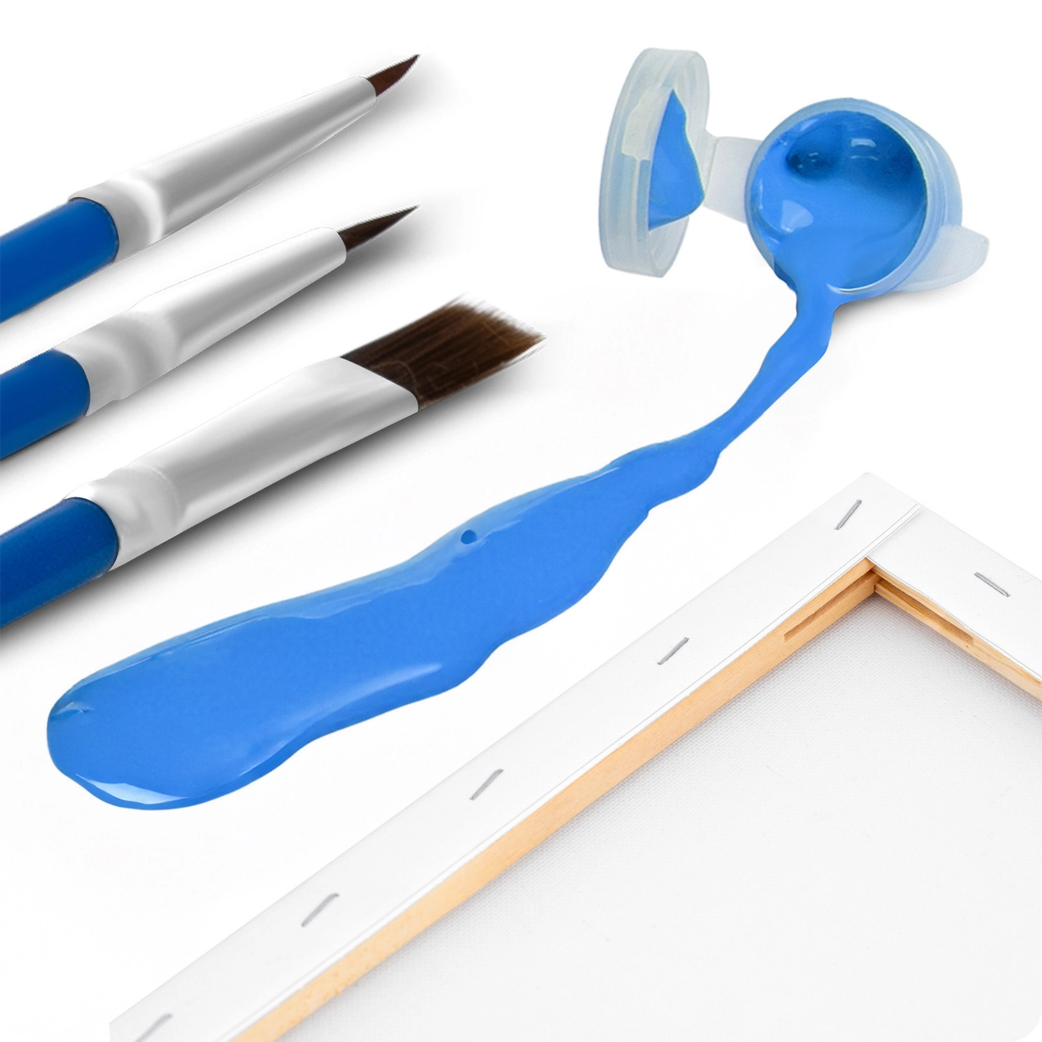 I sættet finder du 30 mættede akrylfarver med en behagelig konsistens, der ikke behøver fortynding, samt 3 pensler til præcisionsarbejde fra baggrund til de fineste detaljer. Fuld dækkeevne skjuler sikkert streger og underlag, så det færdige billede får et professionelt udtryk. Der medfølger også et ophængssæt til hurtig udstilling af det færdige værk.