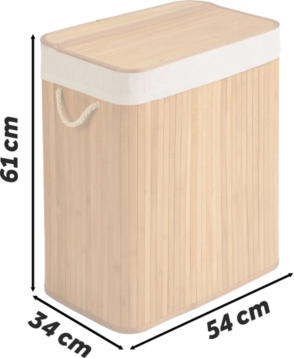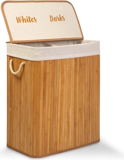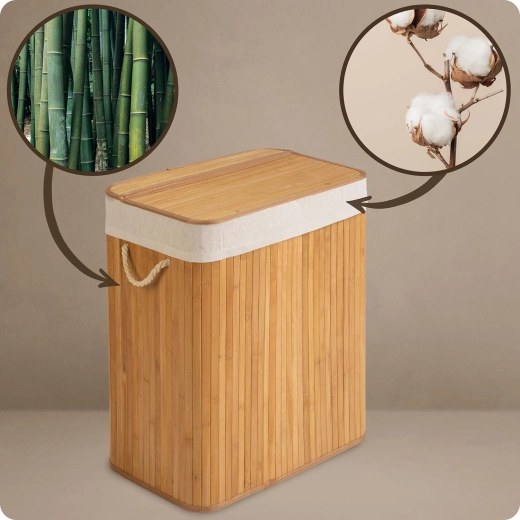 Hold hjemmet ryddeligt med en elegant bambusvasketøjskurv på 100 l. Den har 2 separate rum til lyst og mørkt tøj, en naturlig bambuskonstruktion der er modstandsdygtig over for fugt, og en aftagelig bomuldspose med snøre for nem transport til vaskemaskinen.