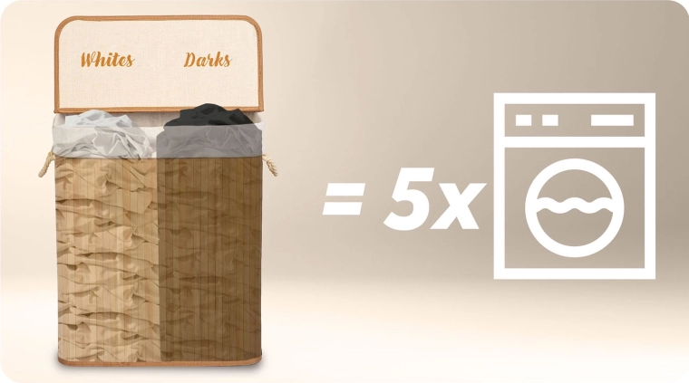 Den todelte vasketøjskurv i naturlig bambus gør den daglige sortering lettere – når du lægger tøjet i, deler du det med det samme op i Lights og Darks. Takket være det store volumen på 100 l rummer den tøj fra flere vaske og holder badeværelset eller soveværelset overskueligt og rent.