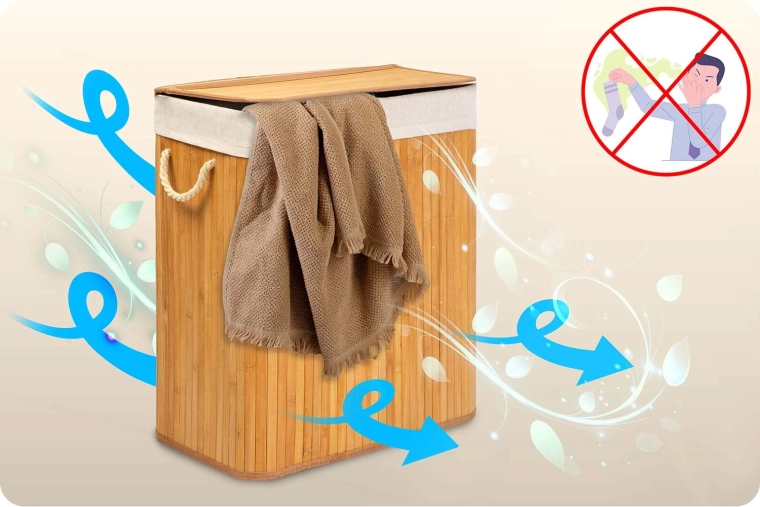 Naturlige materialer – bambus og bomuld – fremmer åndbarhed og hjælper med at reducere fugt og lugt. Den aftagelige bomuldspose kan nemt tages ud, strammes med snøre og bæres direkte til vaskemaskinen. Et praktisk låg, stærke rebhåndtag og en stabil bund sikrer lang holdbarhed og nem håndtering.