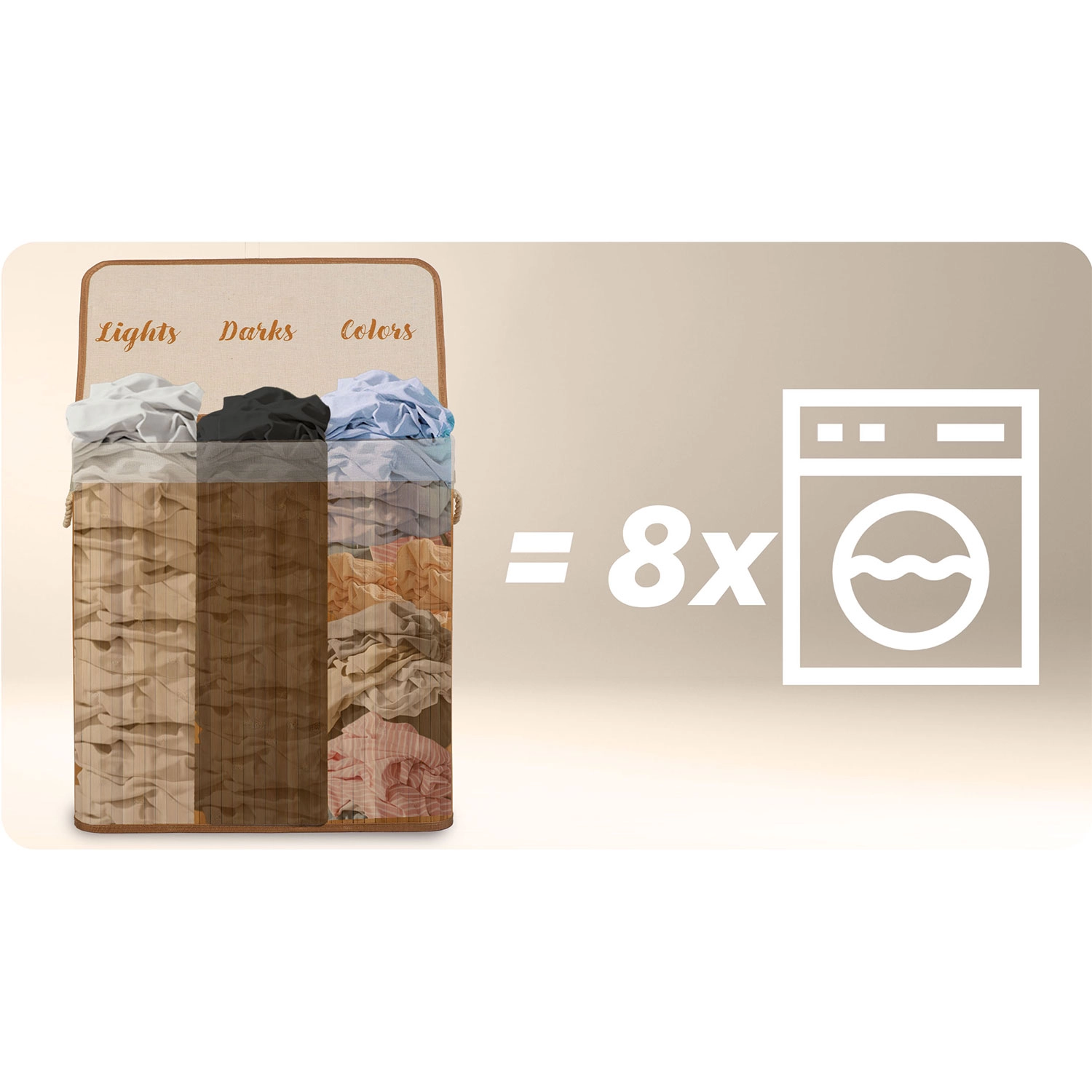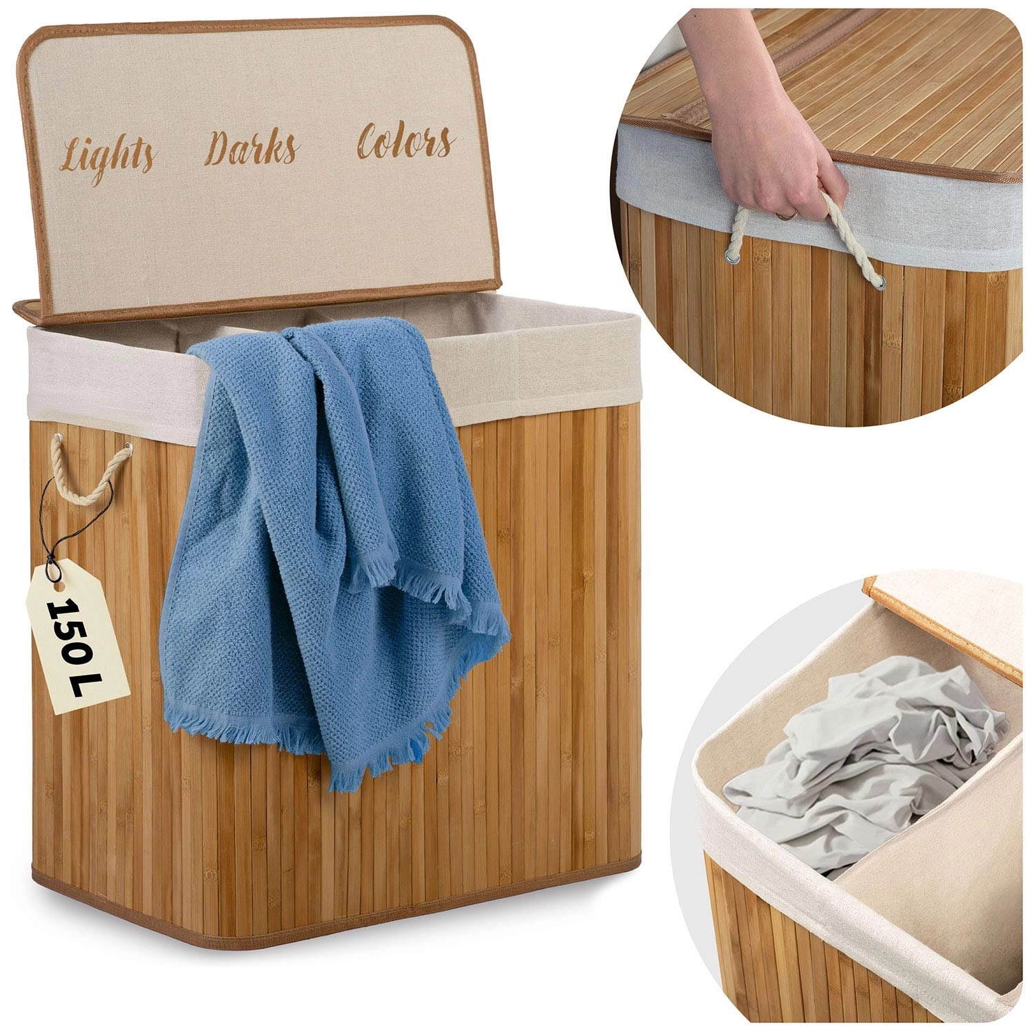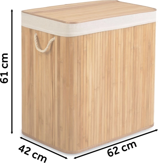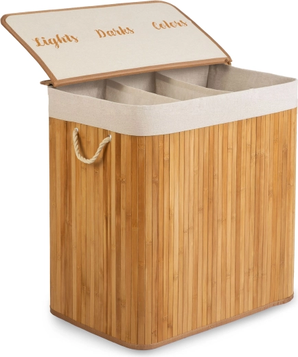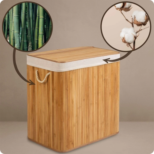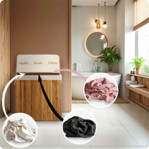 Hold orden og stil derhjemme med denne rummelige bambus vasketøjskurv på 150 l med tre rum til sortering af lyst, mørkt og farvet tøj. Den naturlige bambuskonstruktion er fugtafvisende, robust og ser elegant ud i både badeværelse og soveværelse. Den aftagelige bomuldspose kan nemt løftes ud, snøres til og bæres direkte til vaskemaskinen – uden rod og unødigt omstik.