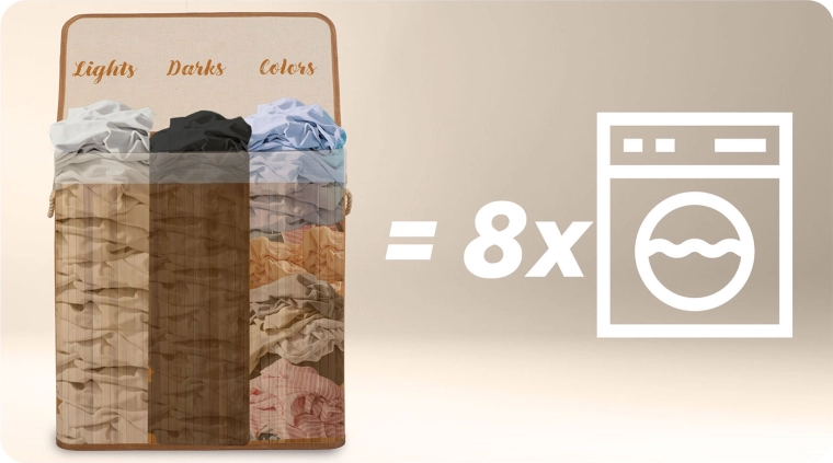 Maksimal funktionalitet og overskuelig sortering i ét. Kurven rummer 150 liter – plads til flere vaske – og tre tydeligt adskilte sektioner med praktisk mærkning på indersiden af låget: Lights, Darks, Colors. Det sparer tid og besvær lige før vask.