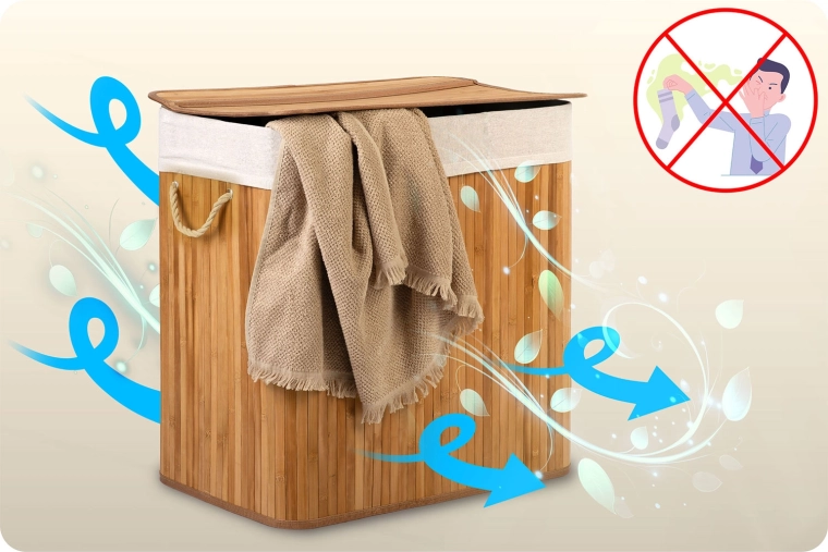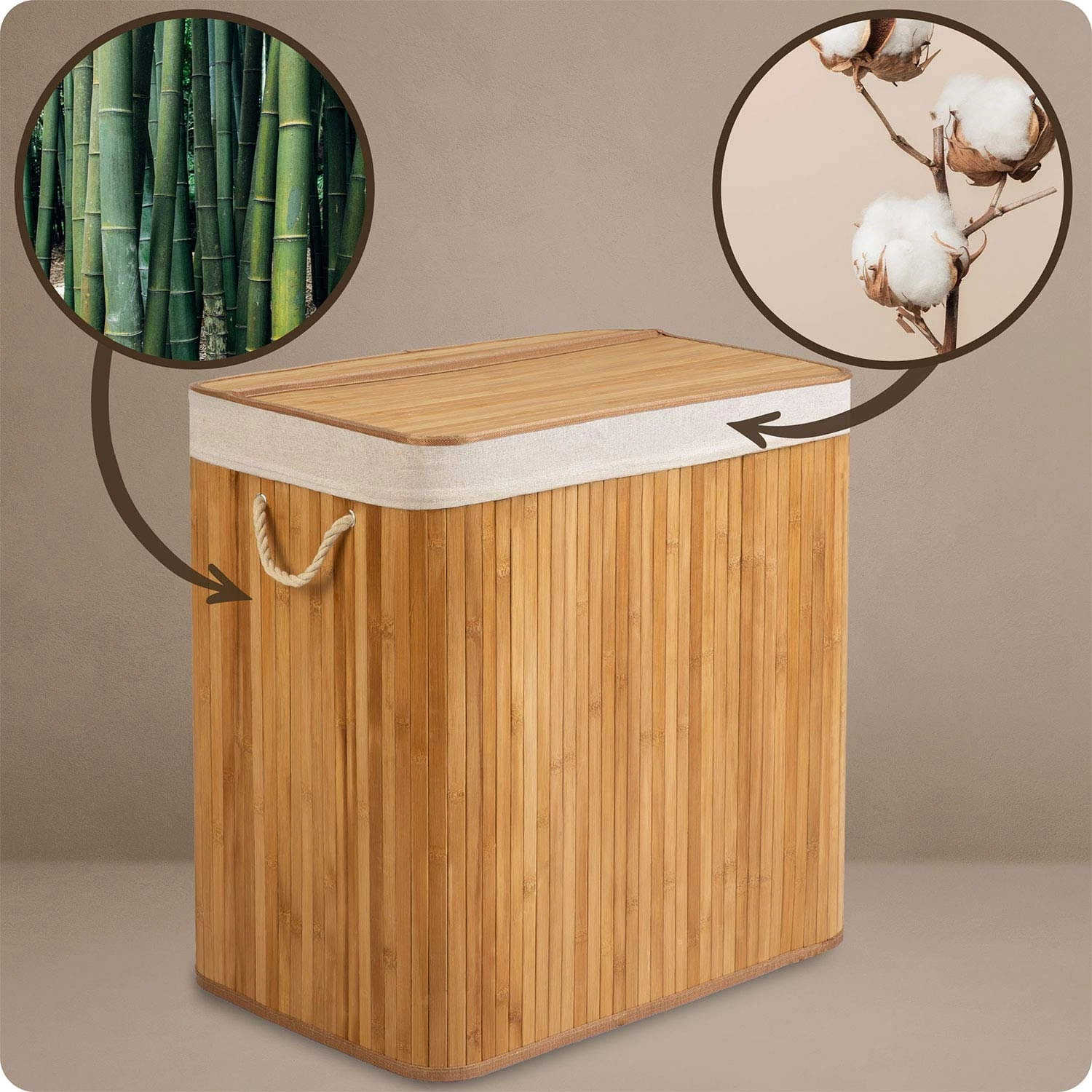 Naturbambus og åndbar bomuld fremmer luftcirkulation og hjælper med at reducere fugt og uønsket lugt. Gennemtænkte detaljer som stærke rebhåndtag, aftageligt låg, aftagelig pose med snørelukning og en stabil fuldbund gør kurven til en slidstærk hjælper i hverdagen.