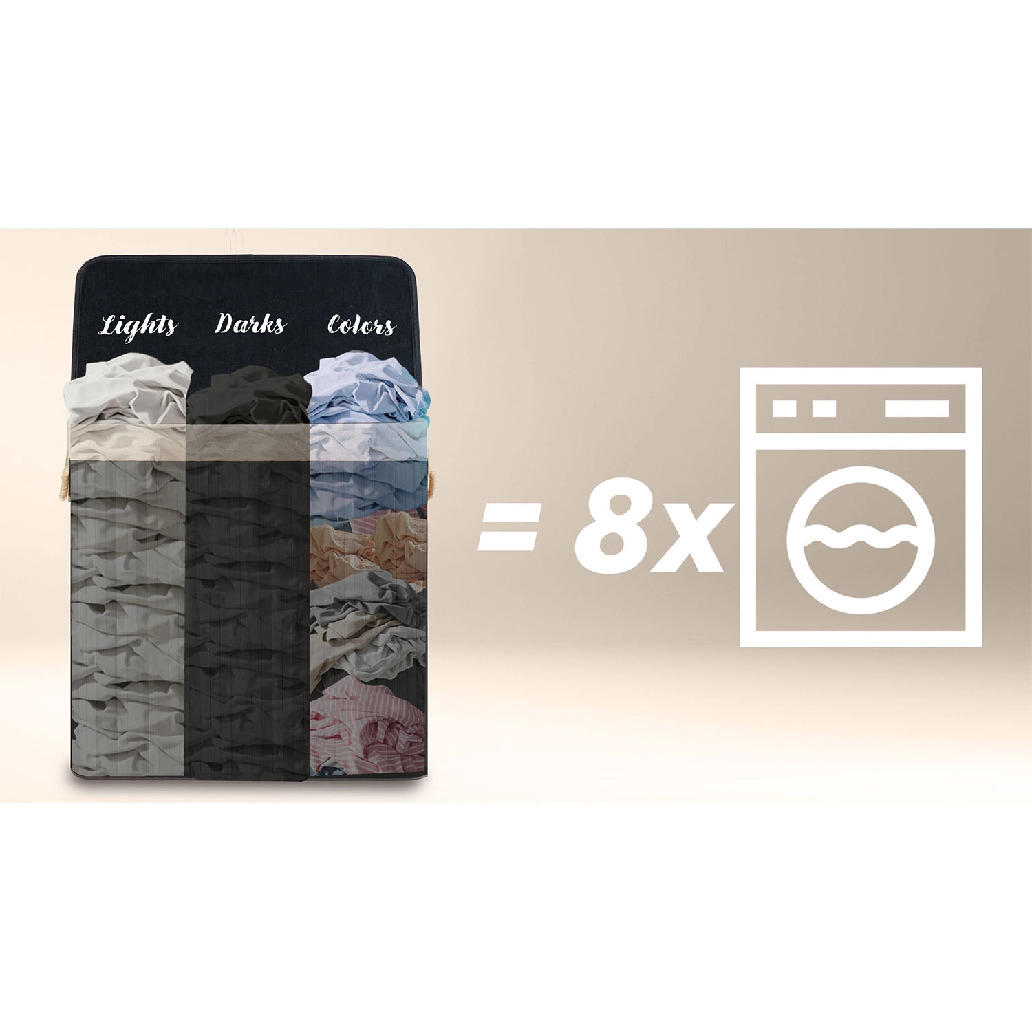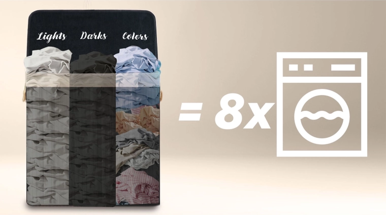 Opdag en praktisk løsning til daglig sortering af vasketøj. Den generøse kapacitet på 150 liter rummer tøj fra flere vaske, mens de tydelige mærkninger Lights / Darks / Colors sparer dig for tidskrævende sortering før vask. Naturlige materialer – bambus og bomuld – fremmer luftcirkulation og reducerer lugte.