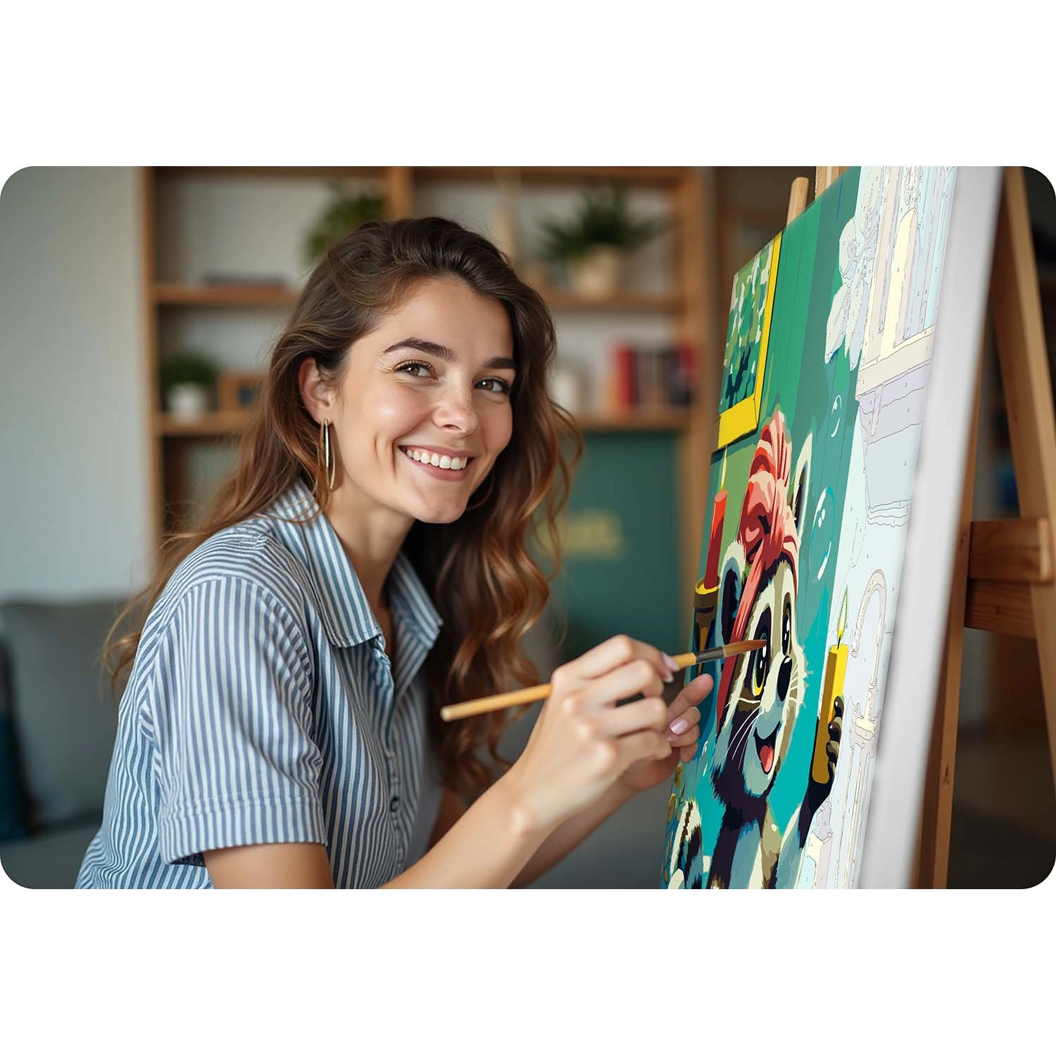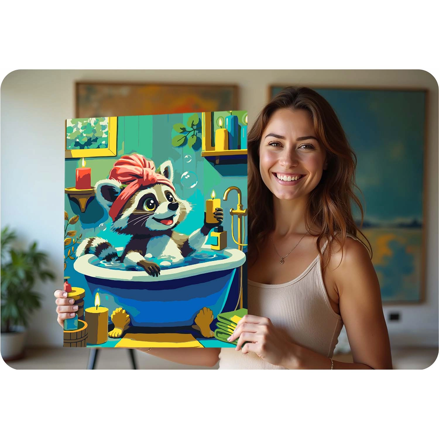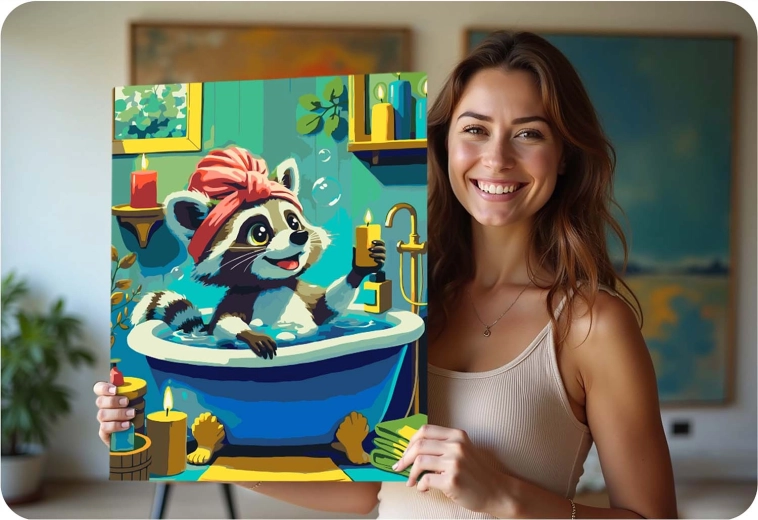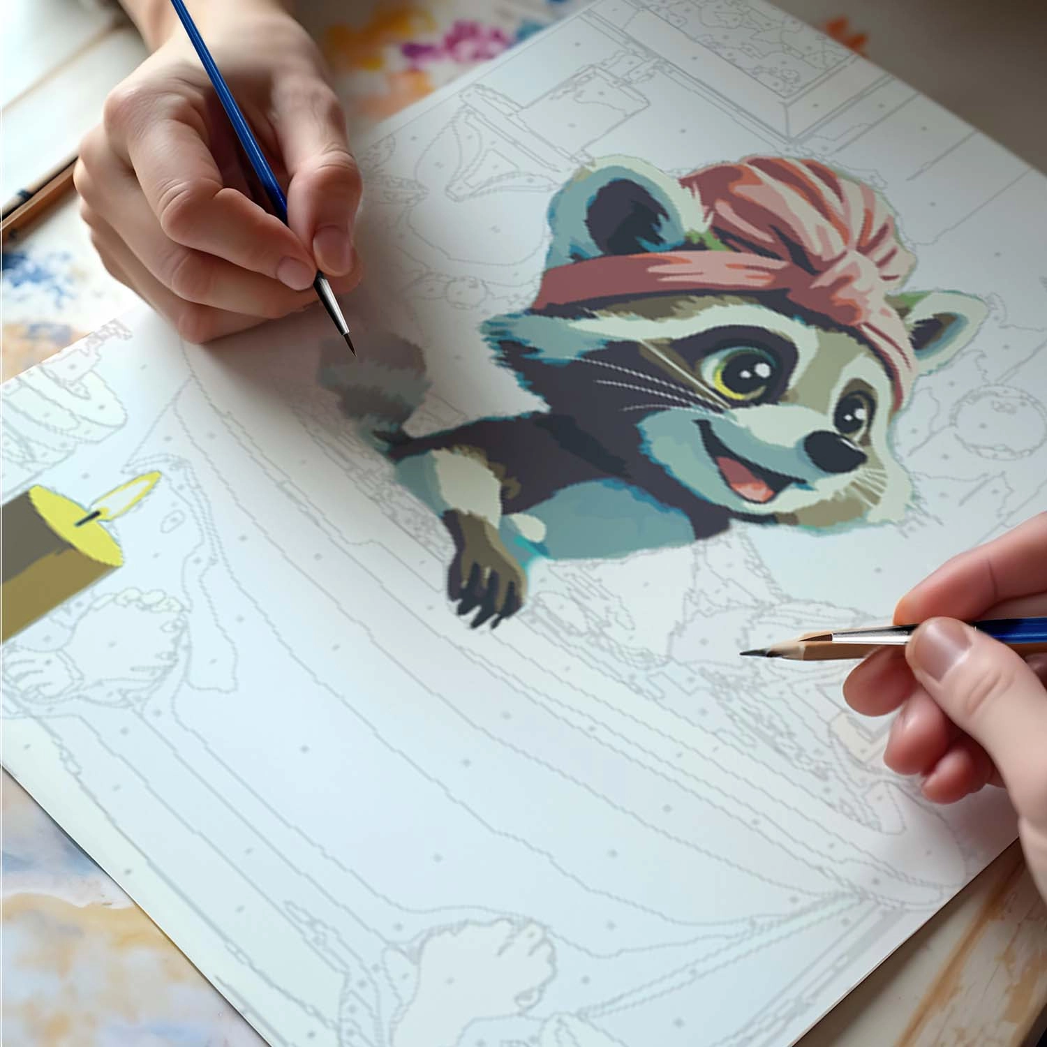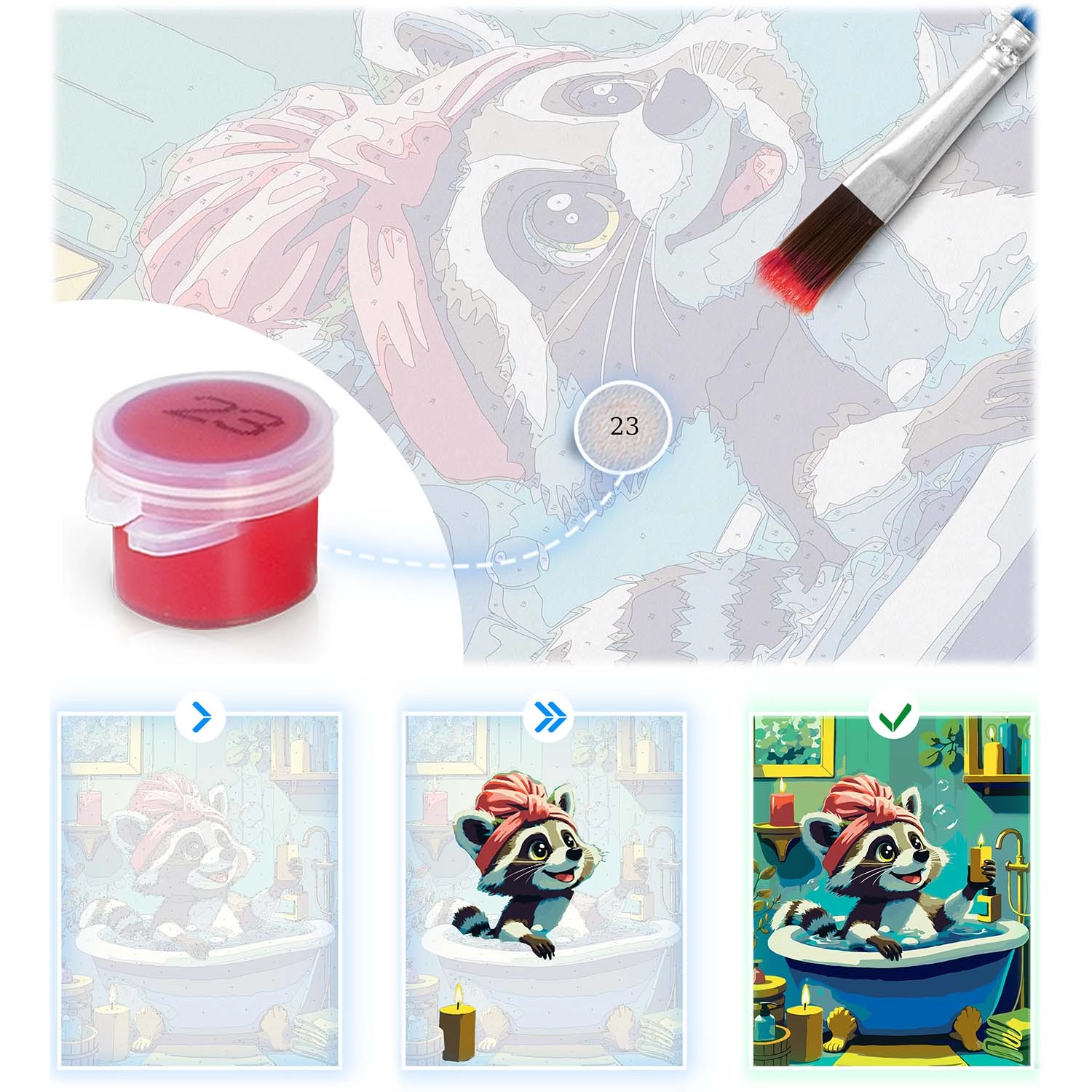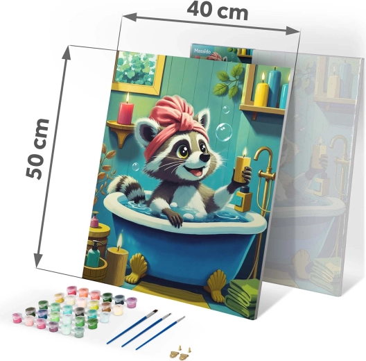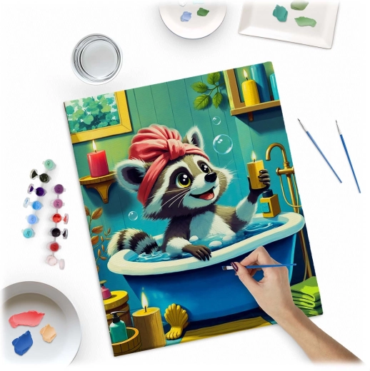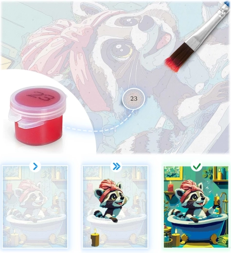 Sættet maling efter tal med et sødt vaskebjørnsmotiv giver en afslappende kreativ oplevelse og et resultat, du stolt kan hænge på væggen. Det fortrykte lærred med farveunderlag og tydelige tal guider dig trin for trin til et smukt billede med intense farver og fuld dækkeevne. Du behøver ikke være kunstner – match blot farvens nummer med feltet og mal.