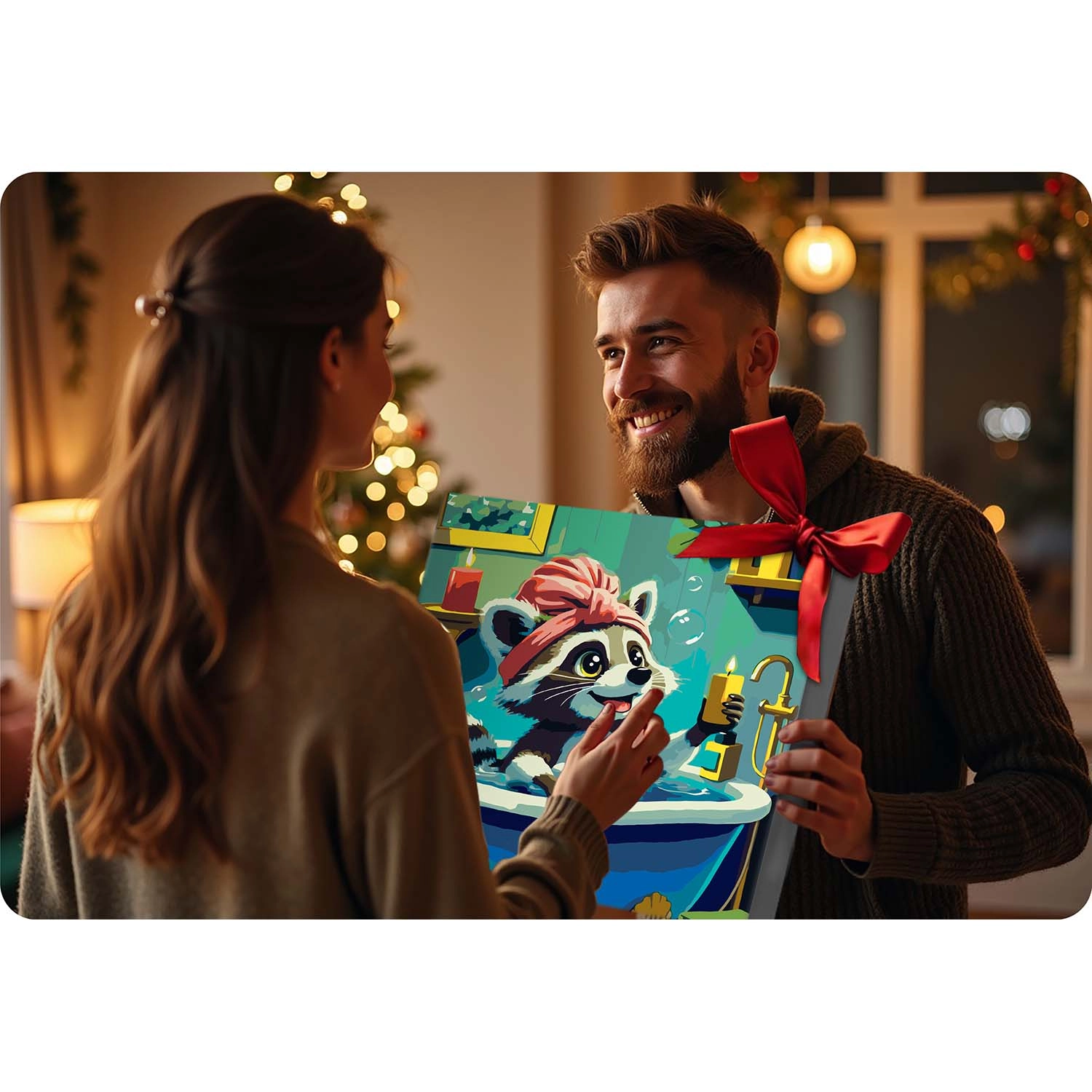 Når du er færdig, hænger du nemt billedet op med de medfølgende kroge. Det søde vaskebjørnsmotiv lyser børneværelset og et legende interiør op.