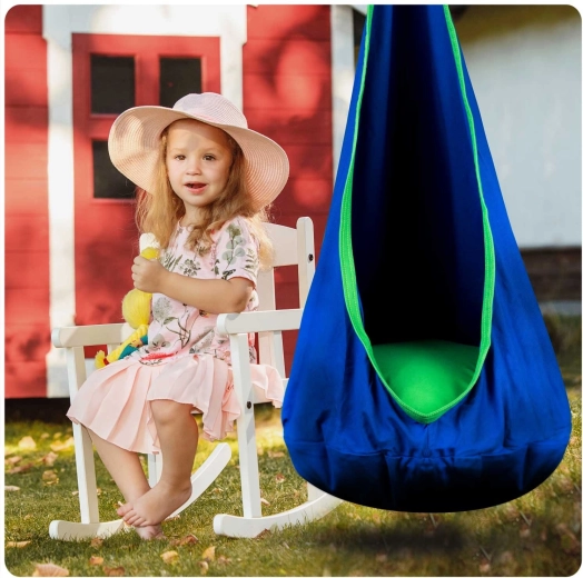 Behagelig hængekokon til børn NEO‑SPORT i blå er et skønt sted til afslapning og blid gyngen både hjemme og i haven. Den tilbyder blød siddepude med hovedpude, stærke sømme og holdbart materiale med bæreevne op til 80 kg. Stoffet kan maskinvaskes, og efter sammenpakning fylder den minimalt.