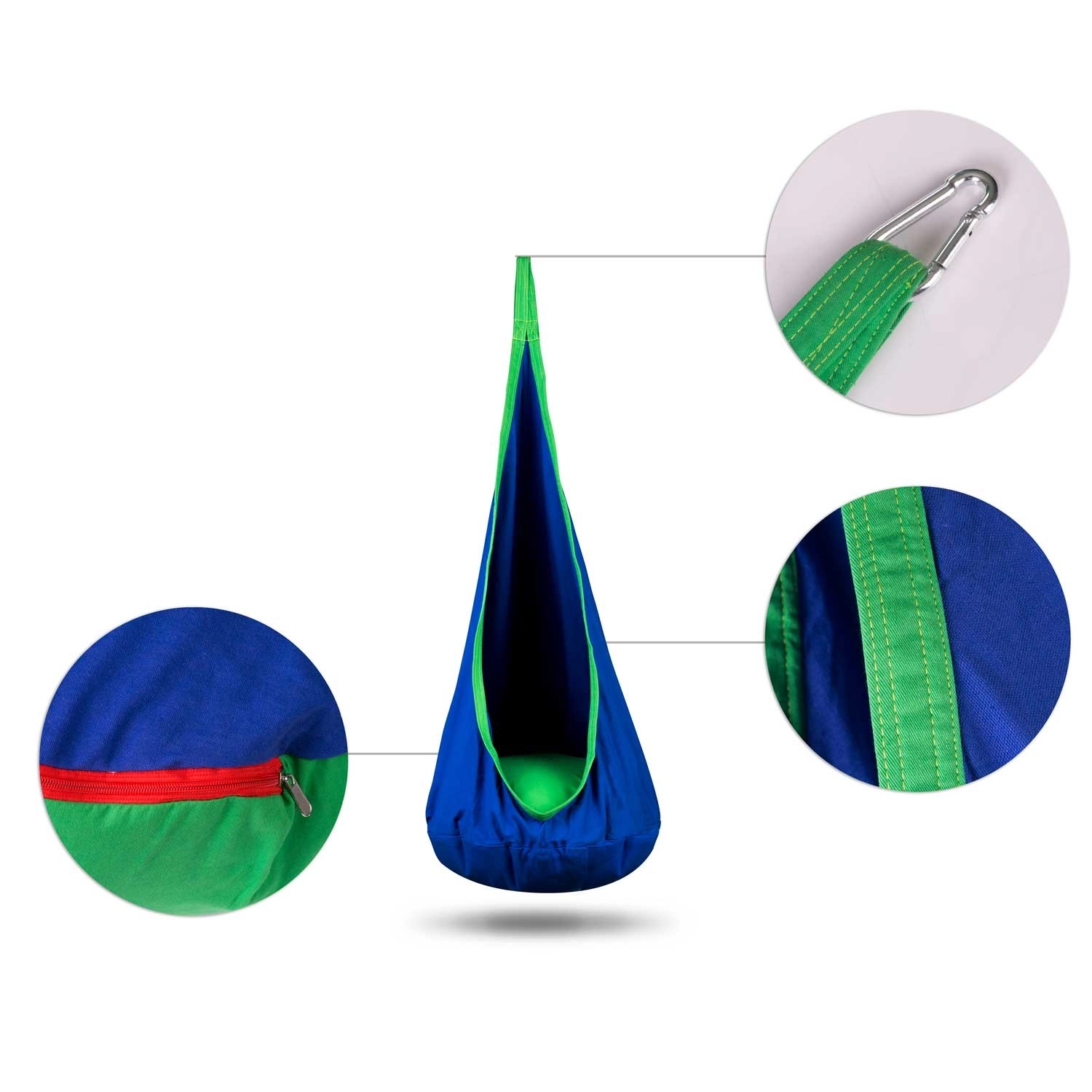 Det praktiske betræk med lynlås gør det let at tage puden ud og vaske den i maskine. Kokonen er lavet af slidstærkt tekstil, der tåler daglig brug. I pakken medfølger også en ophængskrog/karabin, så installationen er hurtig og problemfri.