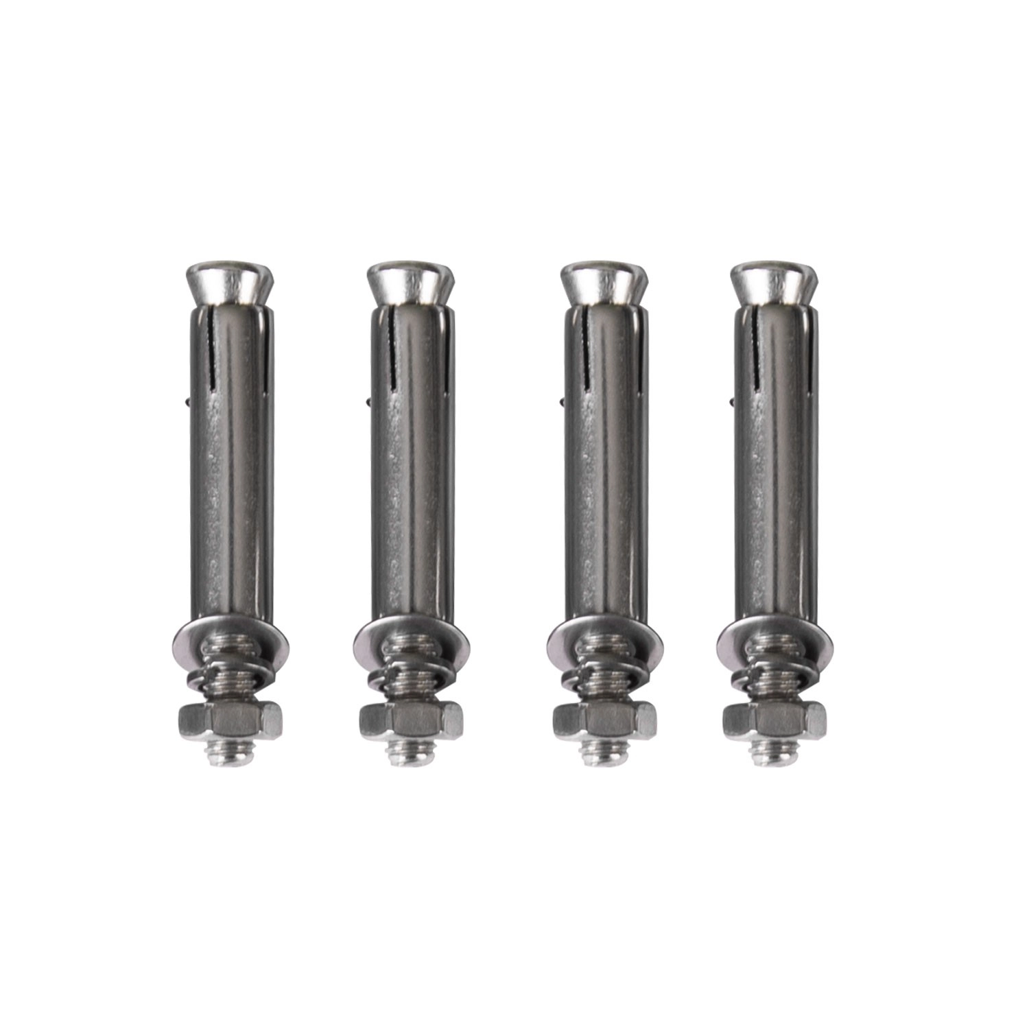 Fire ekspansionsbolte med skiver og møtrikker for pålidelig fastgørelse i beton eller massiv mursten.
