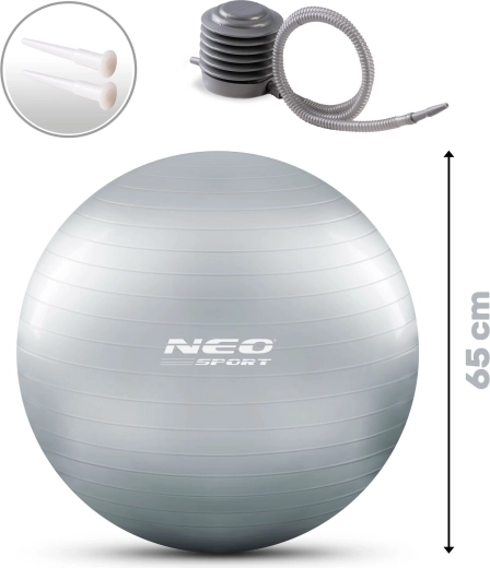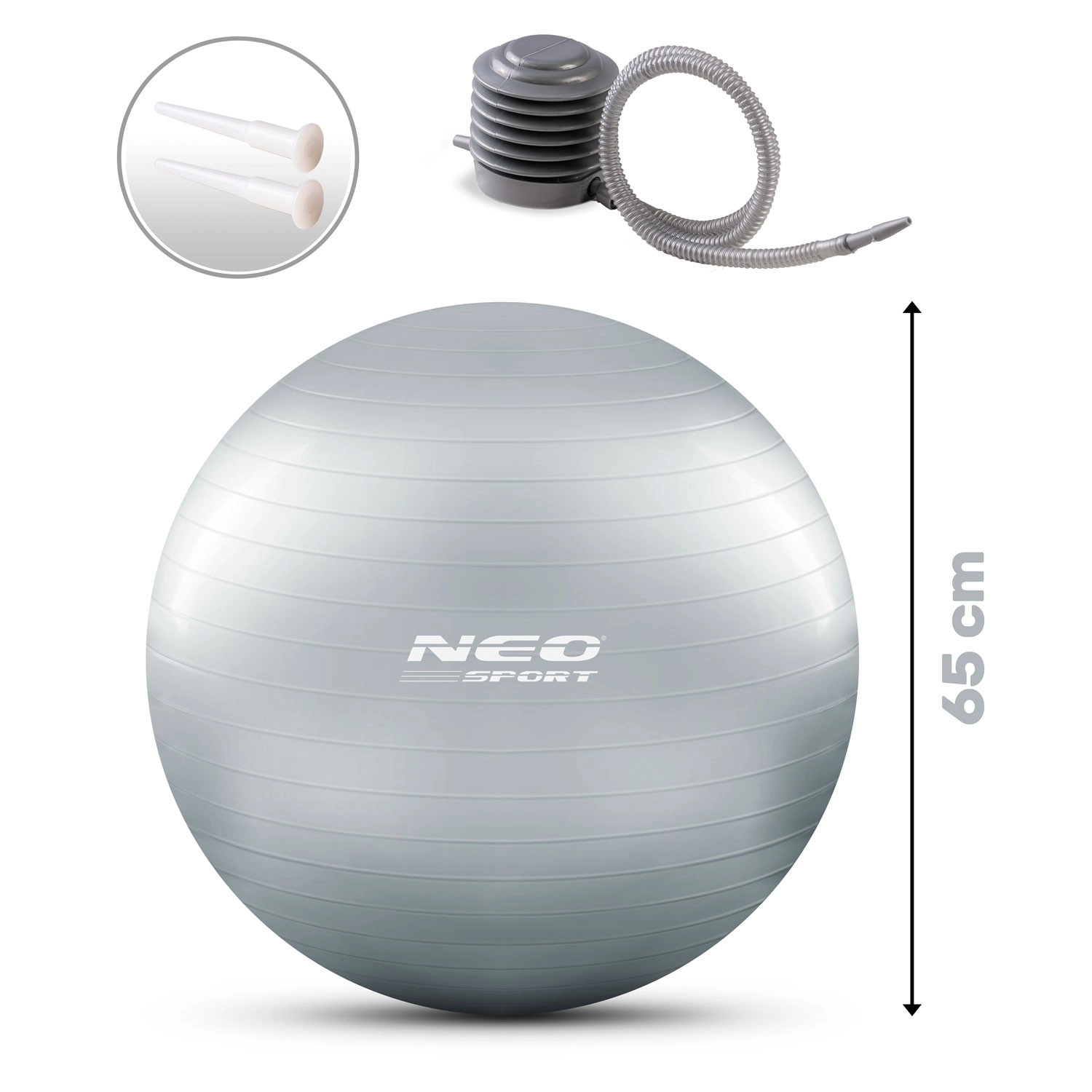 Universel gymnastikbold med en diameter på 65 cm i sølvfarve, ideel til hjemmetræning, genoptræning og kontor. Den tilbyder anti-burst sikkerhedssystem, skridsikker overflade for sikkert greb og stabilitet og er fremstillet af holdbart PVC, der er skånsomt for miljøet. En gratis pumpe med to mundstykker til hurtig oppumpning medfølger.