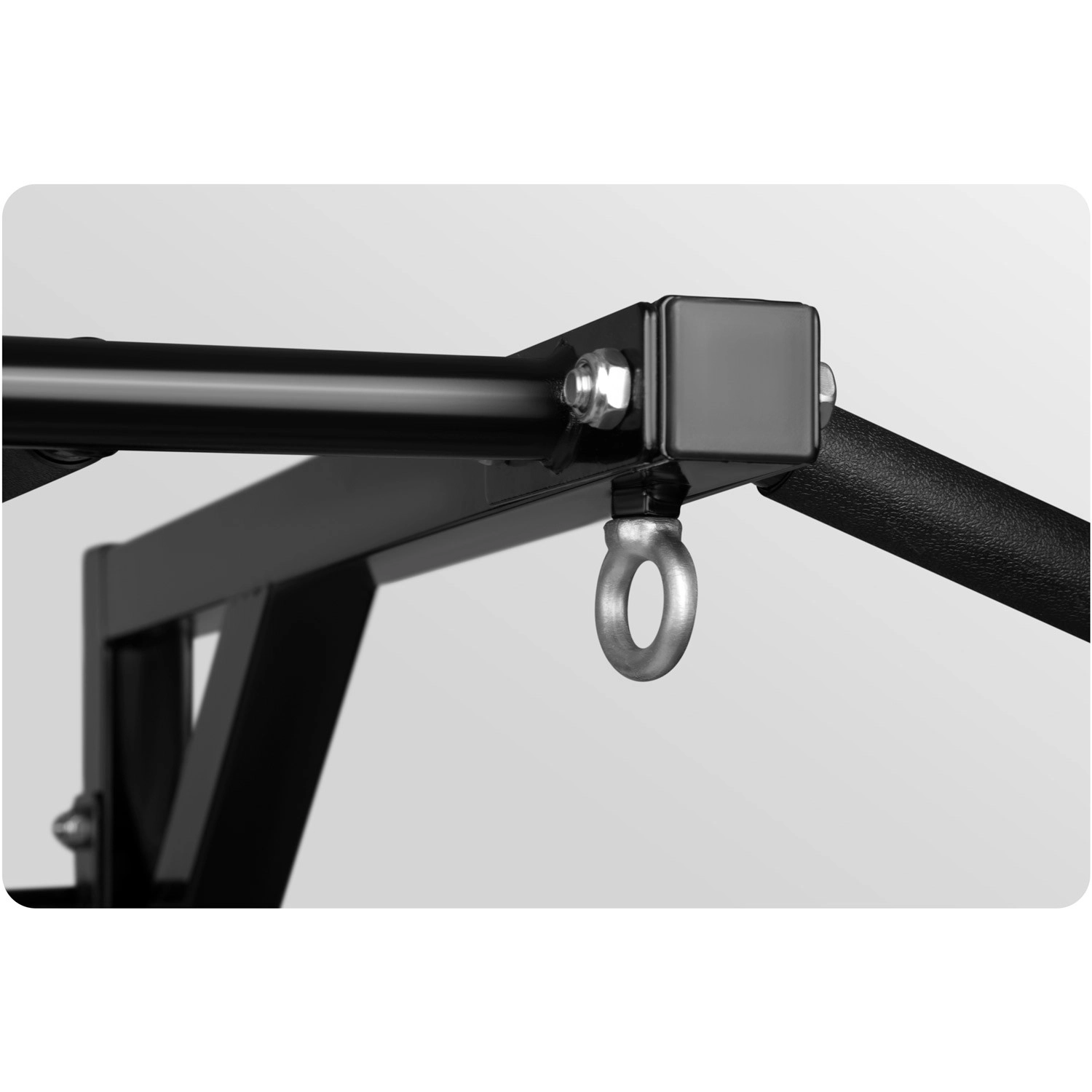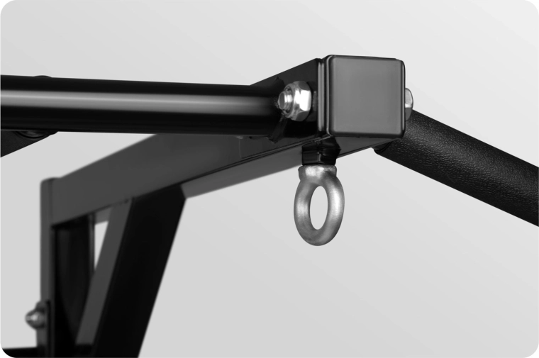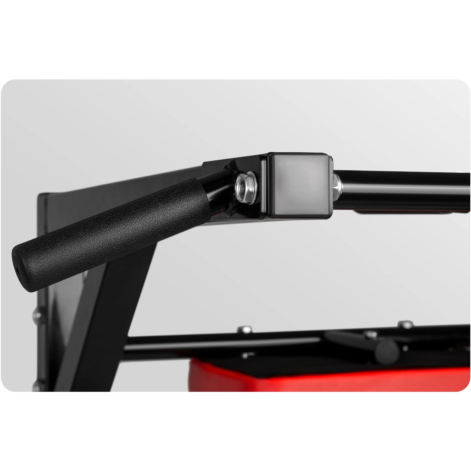 Polstrede ryglæn og armlæn beskytter ved dips og benløft. Forskellige grebsbredder og vinkler udvider øvelsesudvalget.