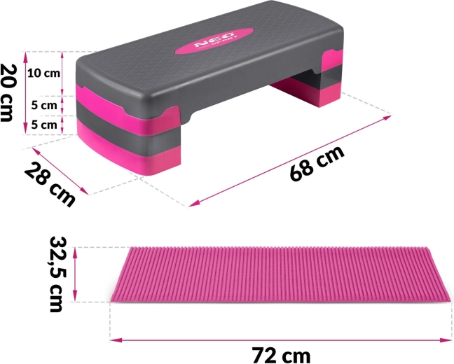 Aerobic step NEO-SPORT giver alsidig træning for både begyndere og øvede. Med tre højdeindstillinger tilpasser du nemt intensiteten – fra dynamisk cardio over styrkeøvelser til balancetræning. Den skridsikre overflade og det sikre fodfæste sørger for trygge bevægelser, selv i højt tempo.