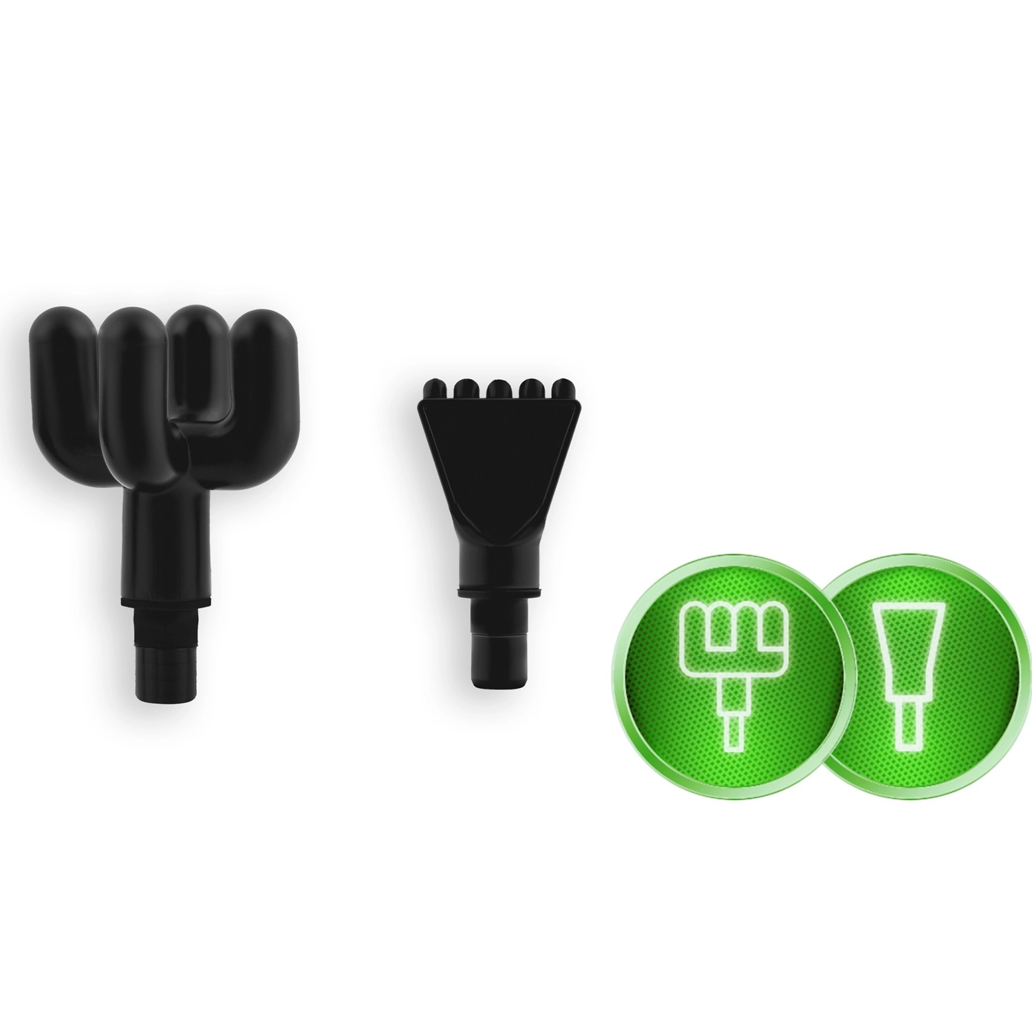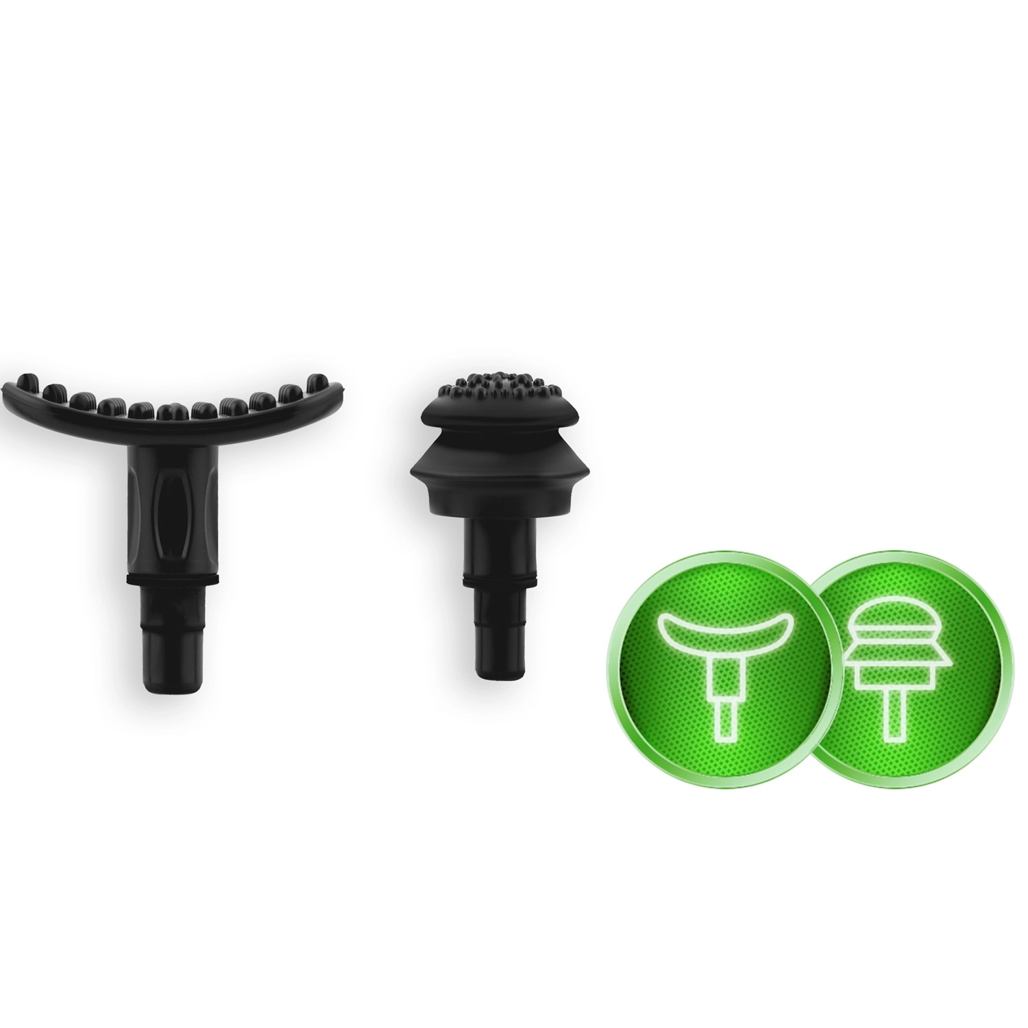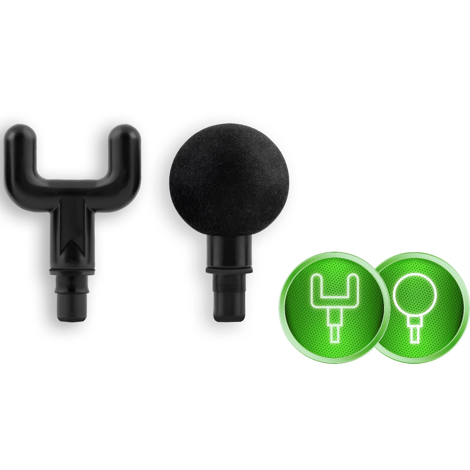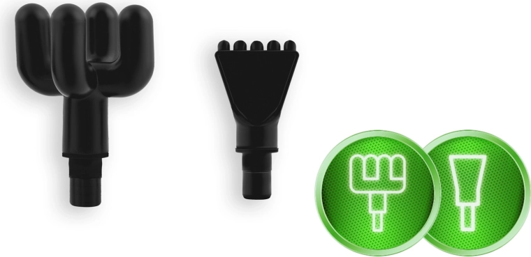 Komplet sæt af tilbehør til forskellige områder: kugle til store muskler, gaffel til området omkring rygsøjlen og sener, fladt hoved til tætvævet væv, “projektil” til punktvis triggerpunkt, firearmet og dobbelt U, spartel til nakke og skuldre, “banan” og blid “svamp” til de mest følsomme steder.