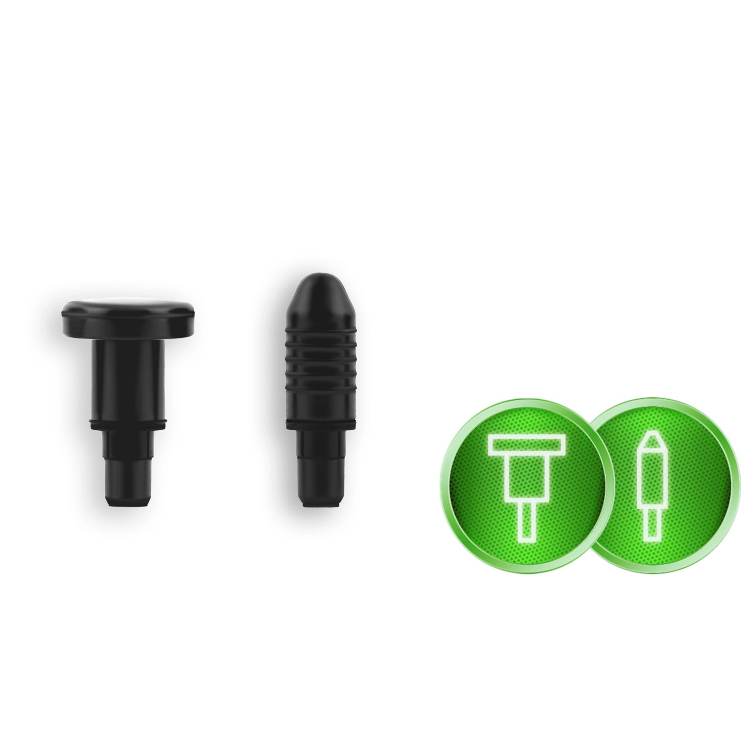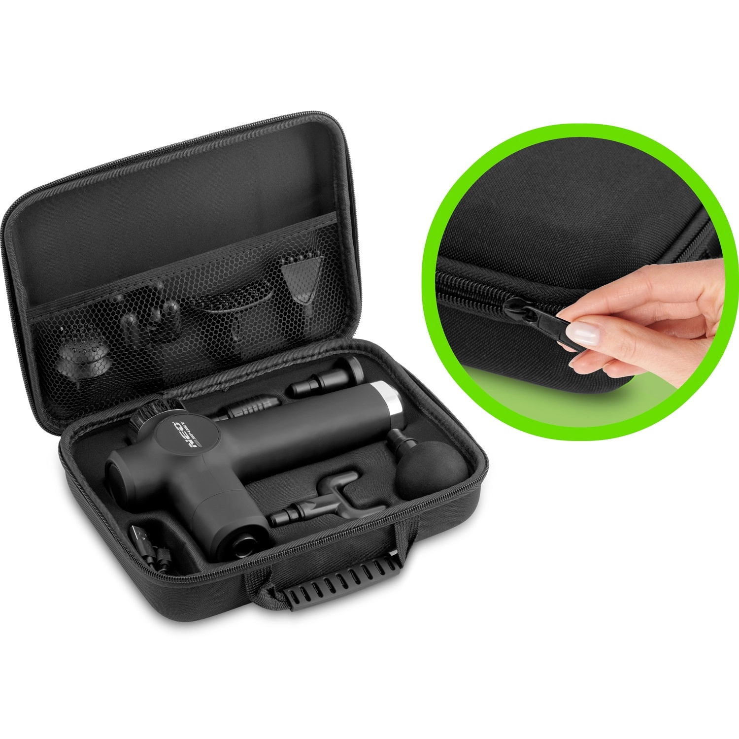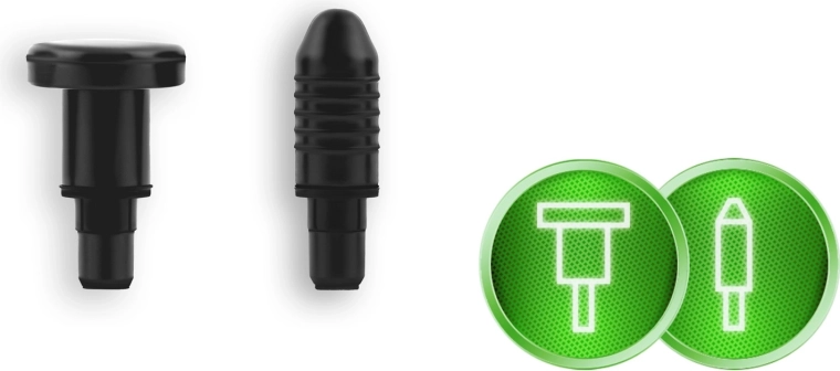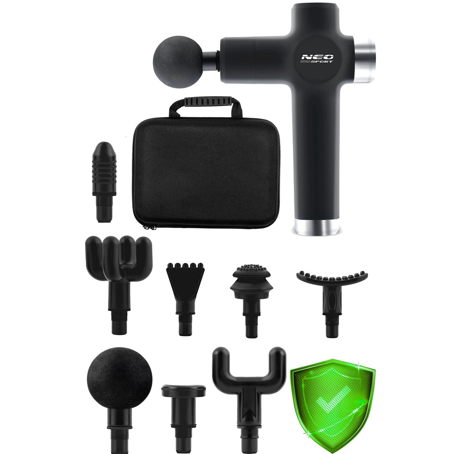Komplet sæt af tilbehør til forskellige områder: kugle til store muskler, gaffel til området omkring rygsøjlen og sener, fladt hoved til tætvævet væv, “projektil” til punktvis triggerpunkt, firearmet og dobbelt U, spartel til nakke og skuldre, “banan” og blid “svamp” til de mest følsomme steder.