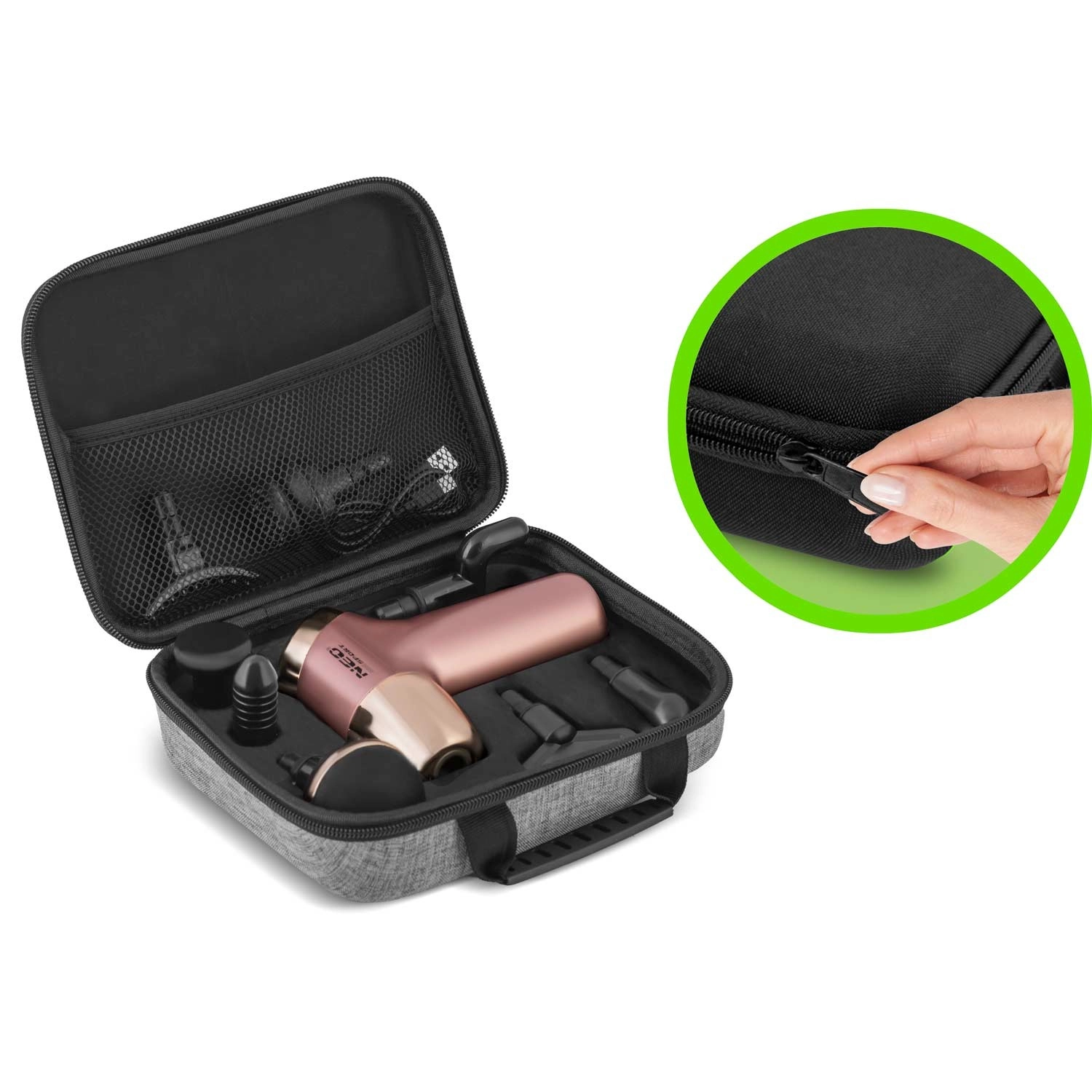 Pakken indeholder 8 specialiserede hoveder til forskellige muskelgrupper, et elegant tekstilrejseetui og et USB‑C-ladekabel. LCD-skærmen gør det nemt at følge hastighed og batteriniveau. Et sikkerhedssystem beskytter motoren mod overbelastning og slukker automatisk enheden ved for højt tryk.