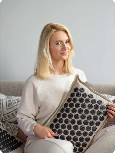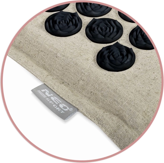 Betrækkene er lavet af 50 % hør og 50 % bomuld, og den indvendige pose er i bomuld. Materialet er behageligt, åndbart og skånsomt mod huden. Heat‑Press-systemet fastgør akupressurpladerne sikkert, hvilket sikrer sikkerhed og lang holdbarhed. Aftagelige betræk med velcrolukning gør vedligeholdelsen markant nemmere.