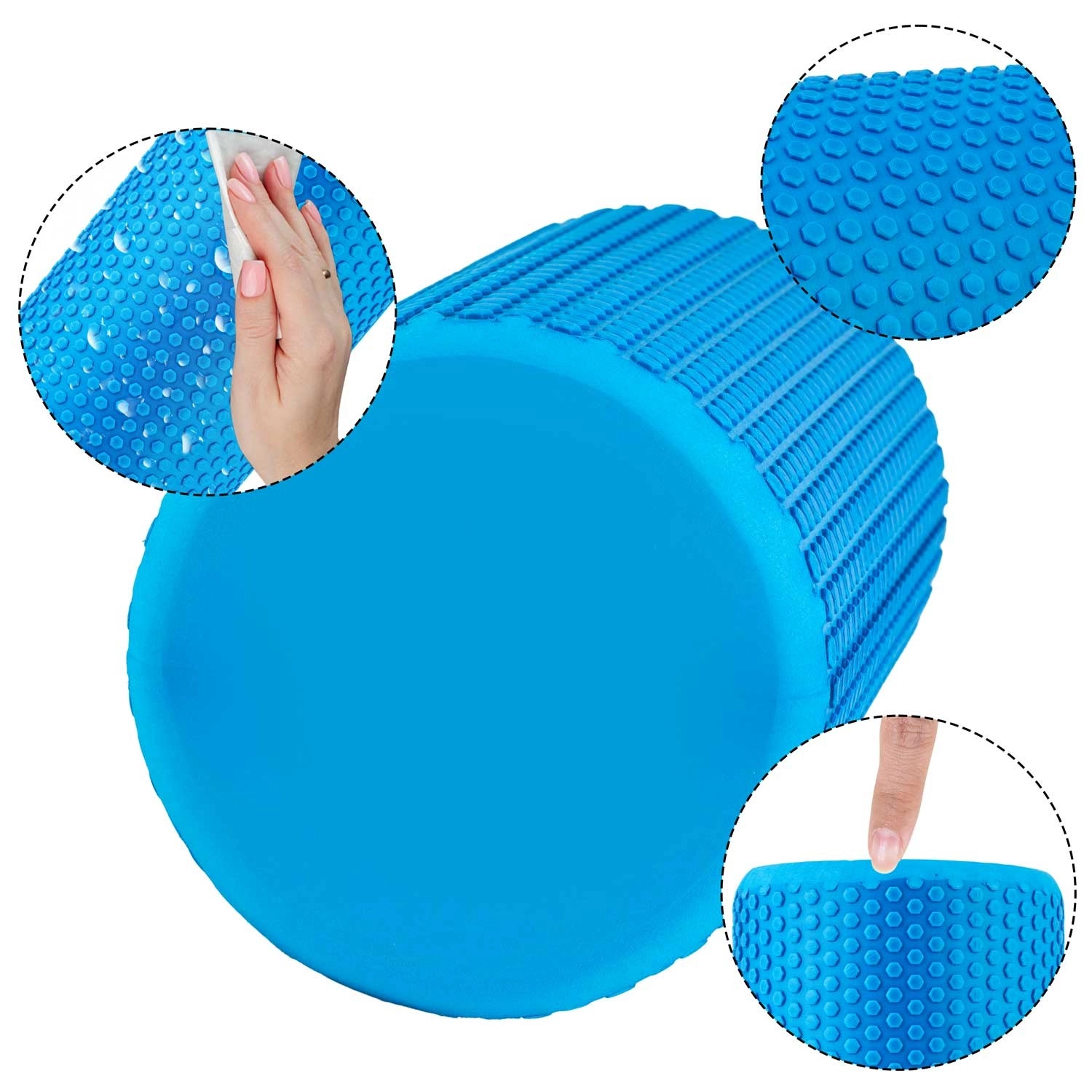 Den teksturerede overflade med forhøjninger giver målrettet vævsstimulering og bedre greb under øvelser. Rullen er velegnet til ryg, ben og arme, hjælper med selvbehandling af triggerpunkter og fremmer blodcirkulationen. Den vandafvisende udførsel gør vedligeholdelsen enkel og hygiejnisk.