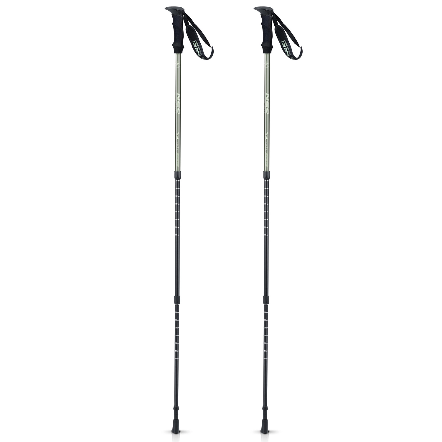 Tre-sektions aluminiumsstave af den robuste legering AL 7075 kan let justeres efter terræn og højde. Den lave vægt gør dem nemme at bære i rygsækken.