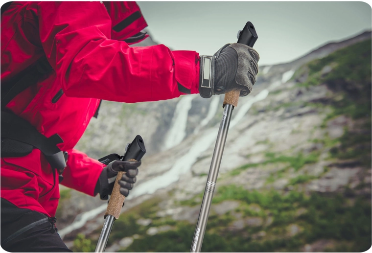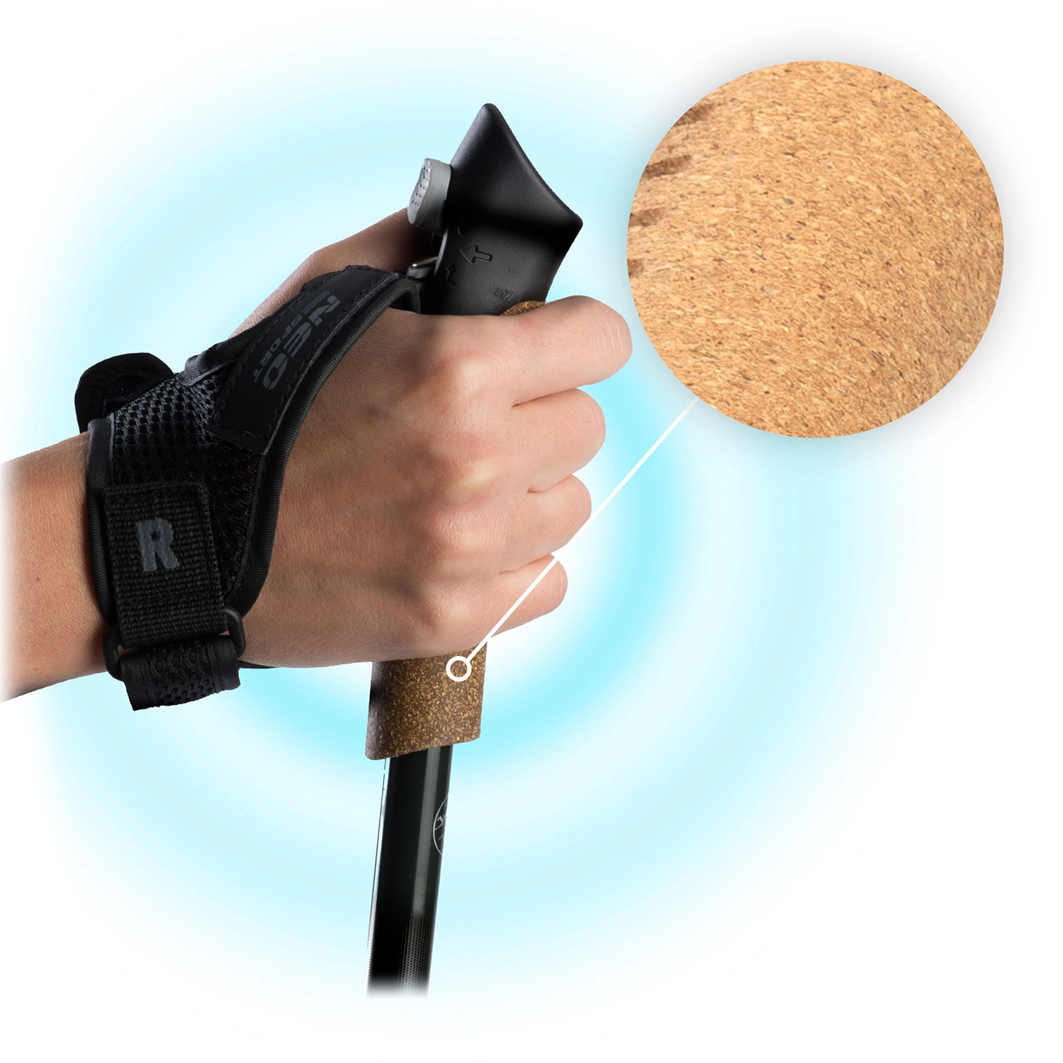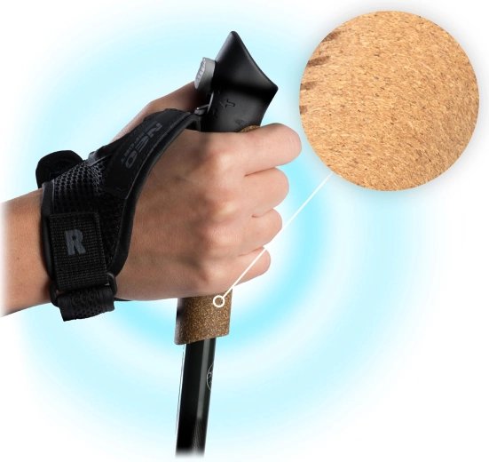 Åndbar kork holder håndfladerne tørre og komfortable. De justerbare håndstropper kan nemt frigøres med ét tryk – fast greb uden trætte fingre, selv på lange ture.